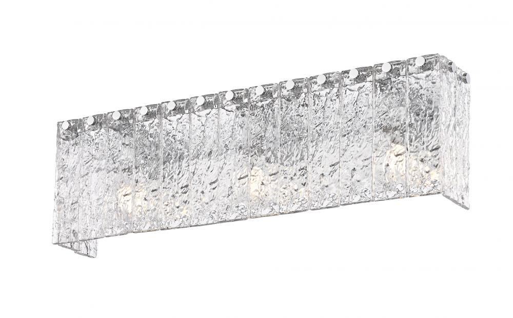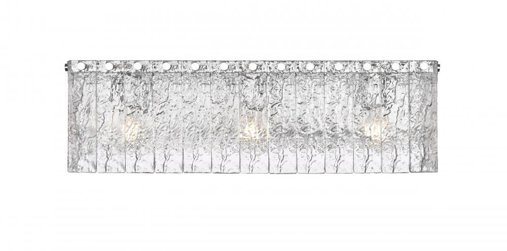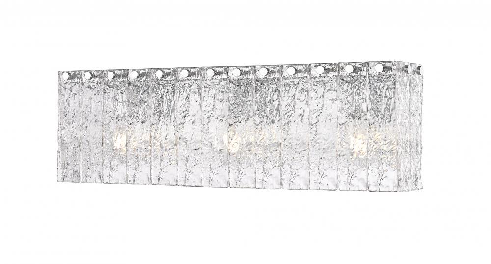 Set the tone with the glittering, icy clear glass panels featured on a modern three-light vanity bath light. A striking centerpiece for your bath, it features a durable steel frame and gleaming chrome finish, creating refined, contemporary ambiance in a primary or guest en suite.