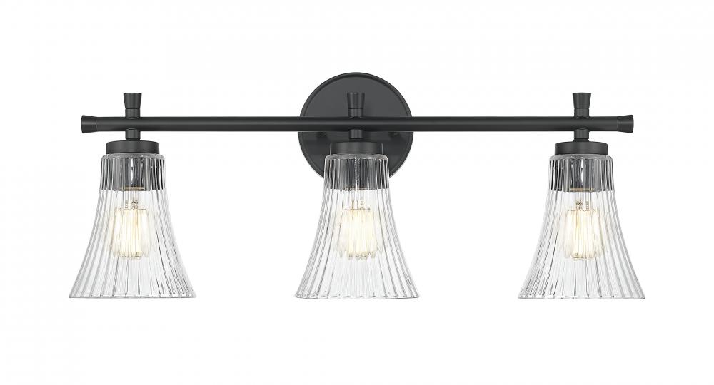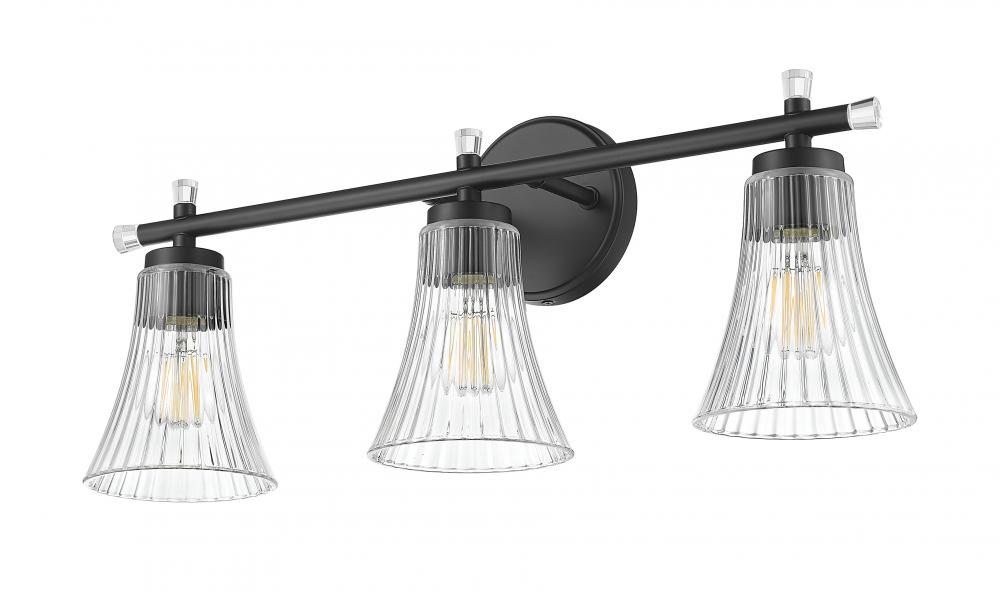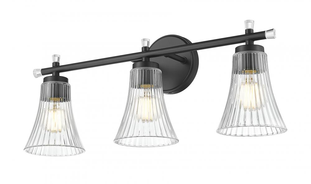 Striking in a matte black finish, this three-light vanity fixture blends bold lines with soft, sparkling curves. The fluted clear glass shades shimmer like cut crystal, adding romantic flair to this structured silhouette. It?s an elevated mix of contrast and grace that?s designed to stand out.