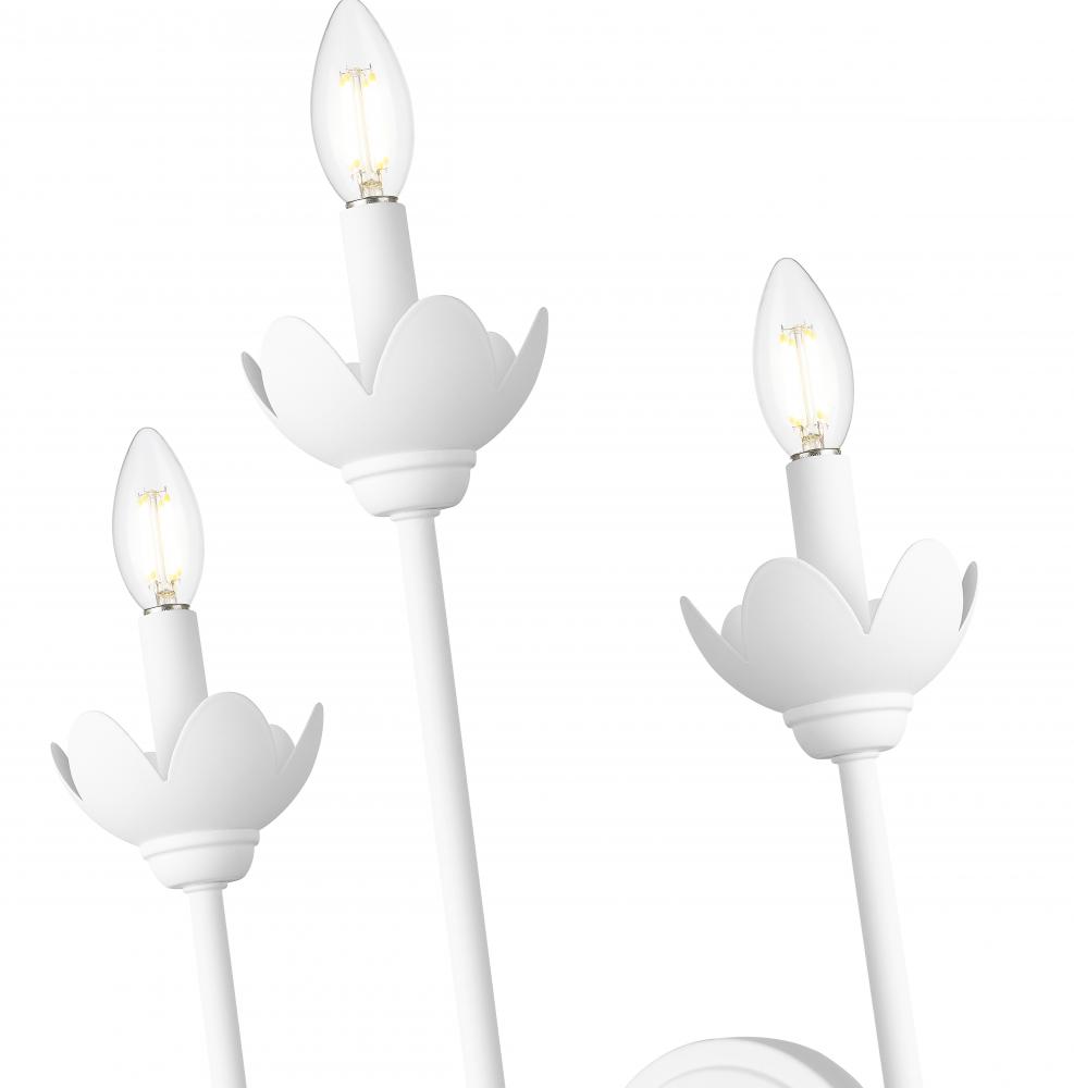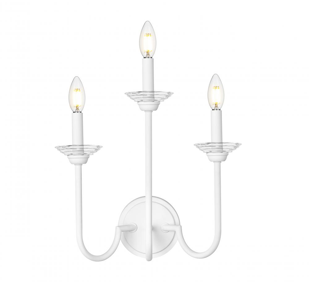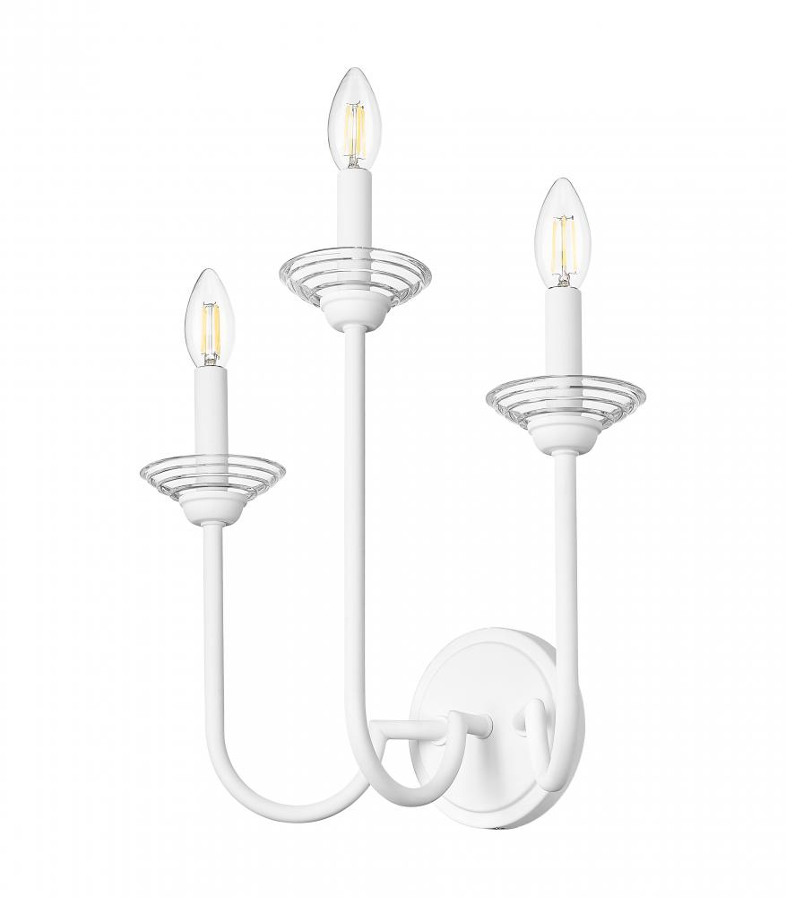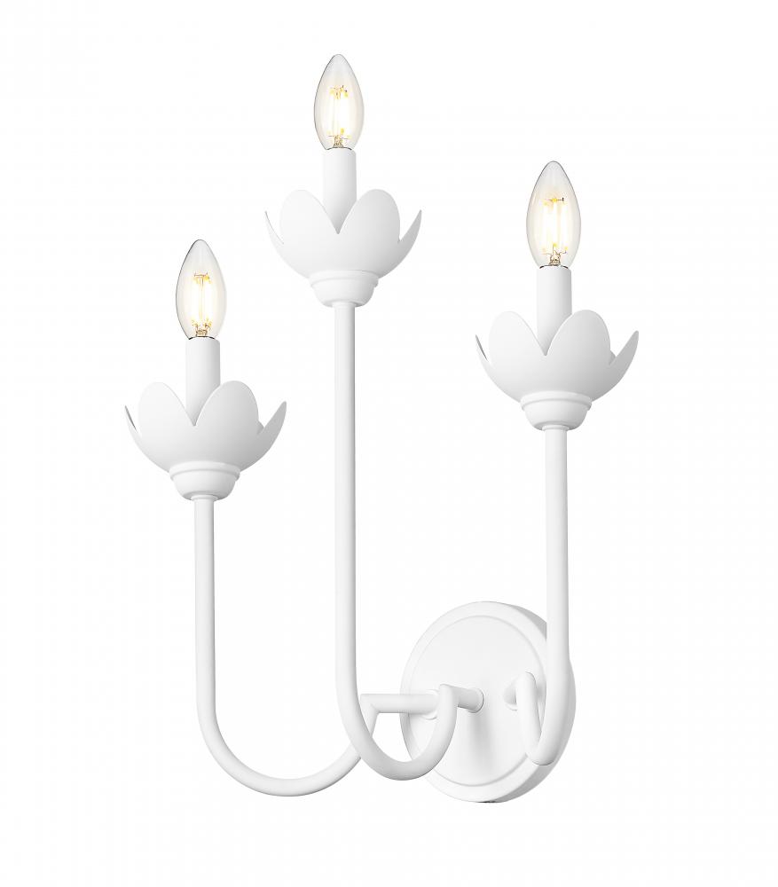Embrace subtle style in your bath or dressing area with this transitional three-light wall sconce. In textured white, it offers a fresh, refined feel with vintage character that works beautifully in a variety of interior decor motifs. Flower petal bobeches are offered in interchangeable white metal and clear glass, allowing for a varied look with the seasons.
