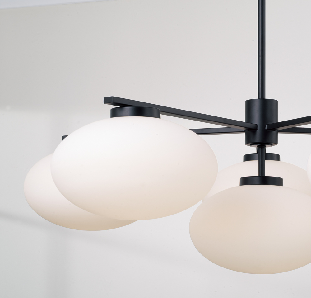 Create a serene aesthetic with the Soren Large Chandelier. Appearing almost weightless, the Soft White glass ovals illuminate a harmonious, ambient glow. The Matte Black finish perfectly punctuates the crisp lines and sleek details.