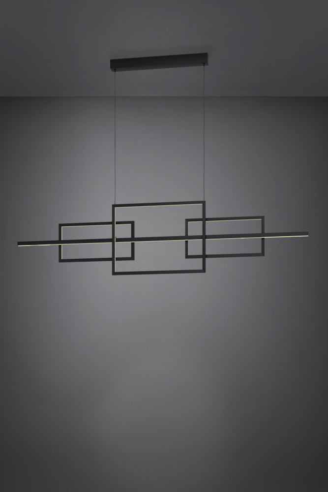The PUEBLA LED pendant has a black metal LED profile suspended on two metal cables. The two rectangular LED elements are offset and give the light its geometric design. The integrated LEDs produce a warm white light. The pendant has a minimalist and modern design that provides classic lighting for any space