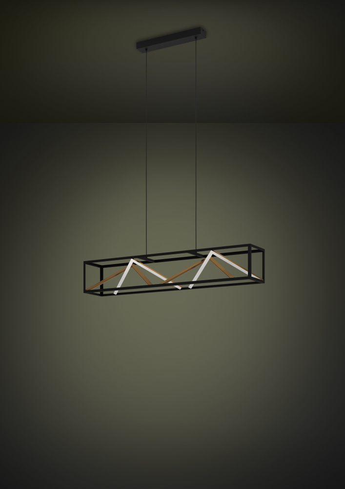 The Penela pendant features a rectangular open cage in black metal, which reveals angled rods that zig-zag inside the frame, which is suspended by two cables. Inspired by the Chilean mountains, the angles resemble mountain peaks. Each bar has a gold finish one side, and a bar of diffused integrated LED light on the other side, making it a dramatic addition to any space.