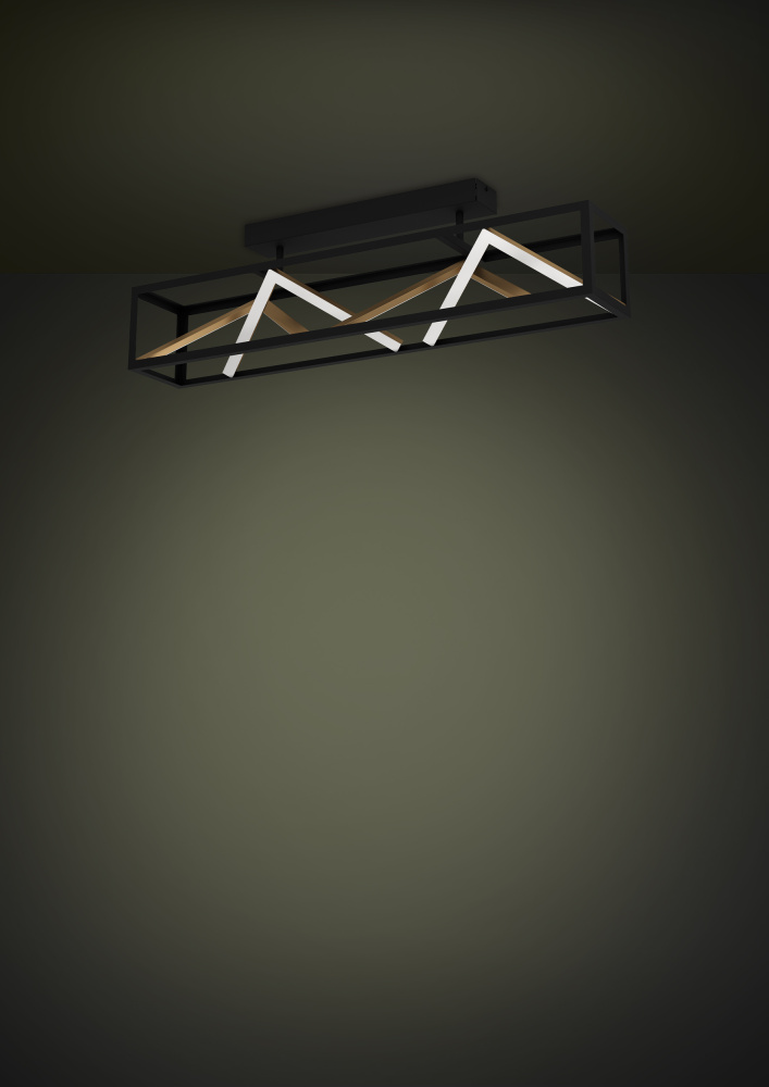 The Penela flush mount features a rectangular open cage in black metal, which reveals angled rods that zig-zag inside the frame. Inspired by the Chilean mountains, the angles resemble mountain peaks. Each bar has a gold finish one side, and a bar of diffused integrated LED light on the other side, making it a dramatic addition to any space.