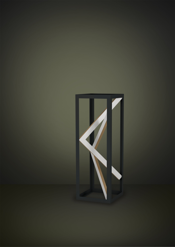 The Penela table lamp features a rectangular open cage in black metal, which reveals angled rods that zig-zag inside the frame. Inspired by the Chilean mountains, the angles resemble mountain peaks. Each bar has a gold finish one side, and a bar of diffused integrated LED light on the other side, making it a dramatic addition to any tabletop. The light also features a three-step touch dimmer for added light versatility.