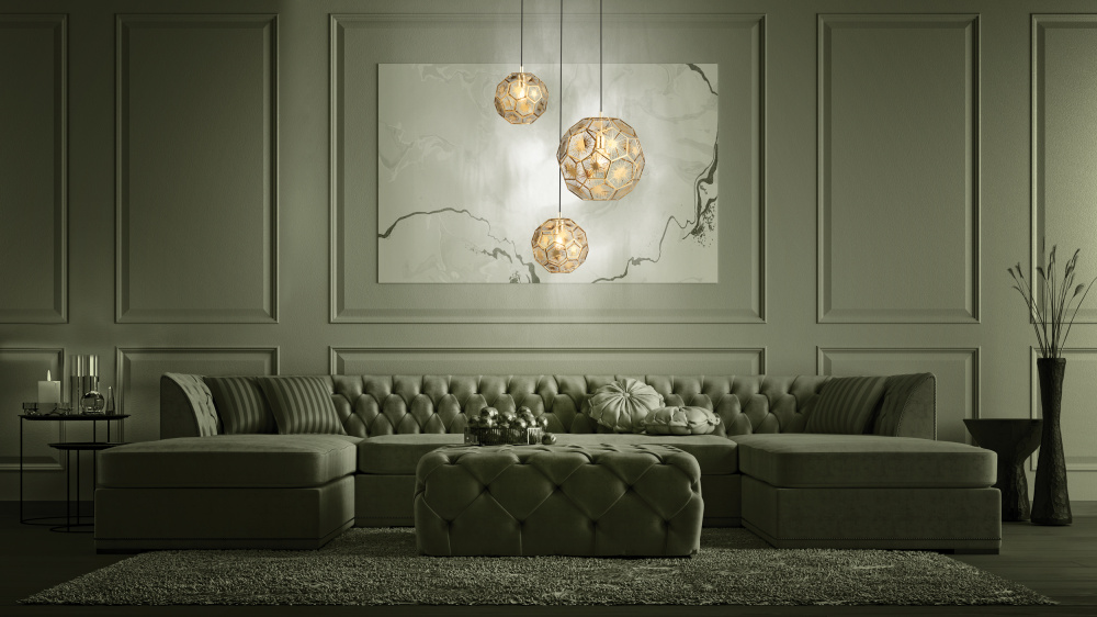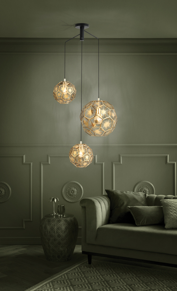 The SKOURA pendant light has three brass-coloured metal shades of various sizes in a chic geometric design. When the light is on, it creates a fascinating play of light and shadow through the cut-out detailing. The pendant light has an elegant design with a unique cluster style that offers a distinctive, eye-catching feature in any room.