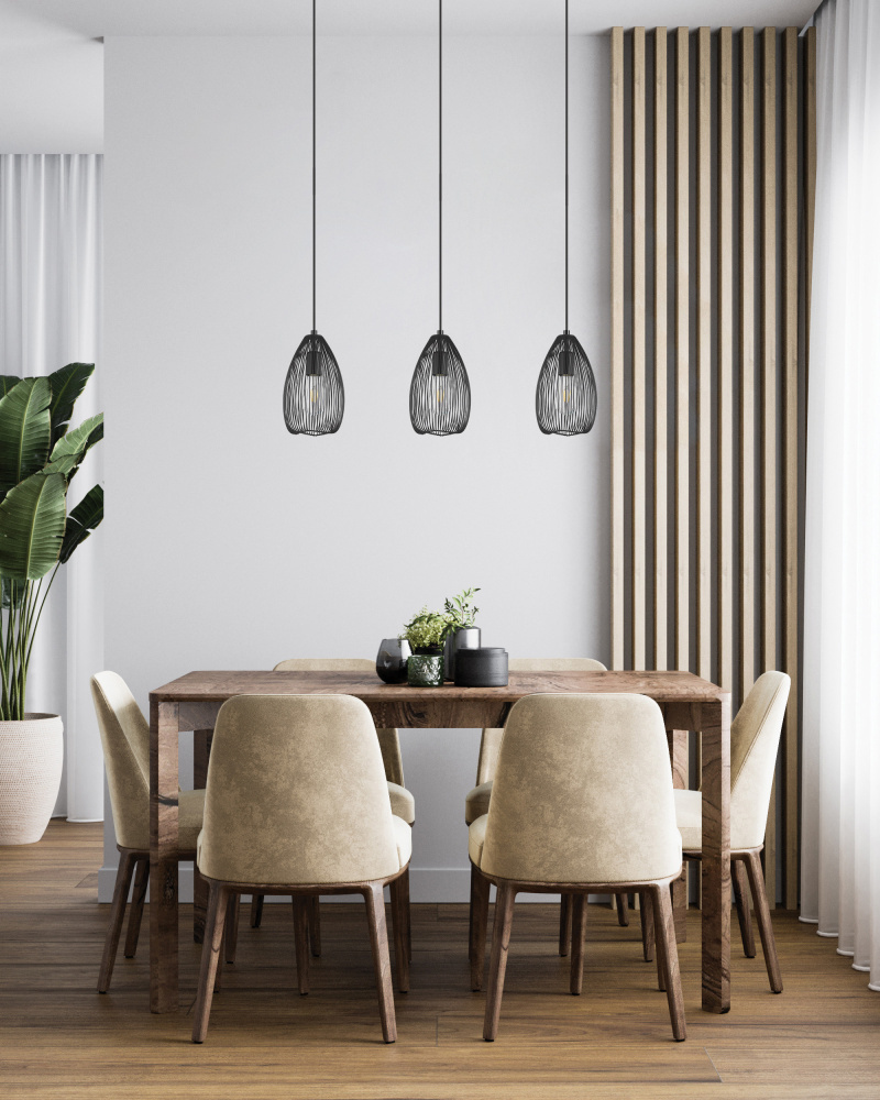 The CLEVEDON 3 light linear pendant light has teardrop-shaped wire shades in black paired with an elongated black metal canopy. The shades creates a fascinating play of light and shadow as soon as the light is on. The pendant light blends seamlessly into modern interiors. The design provides distinctive lighting for any space, whether in the living room or dining room.