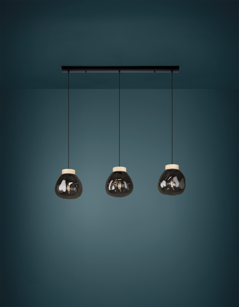 The Magacela three-light linear pendant is a perfect mix of natural and prestigious materials. Composed of organically shaped smoked glass shades with a lightly metallic finish and wood accents, this timeless suspended light fits elegantly with modern and contemporary designs. Whether in the kitchen or dining room, this three-light pendant will add the right amount of charm.