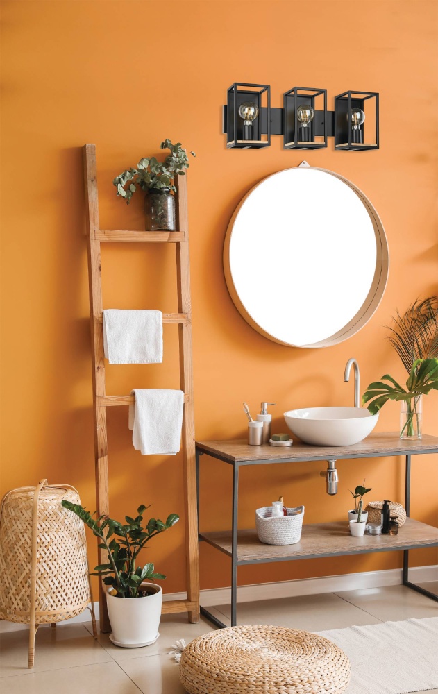 The Libertad bath/vanity light features a structured black metal open frame surrounding open bulbs. A natural wood accent offers a toned down element against the structured black frame.