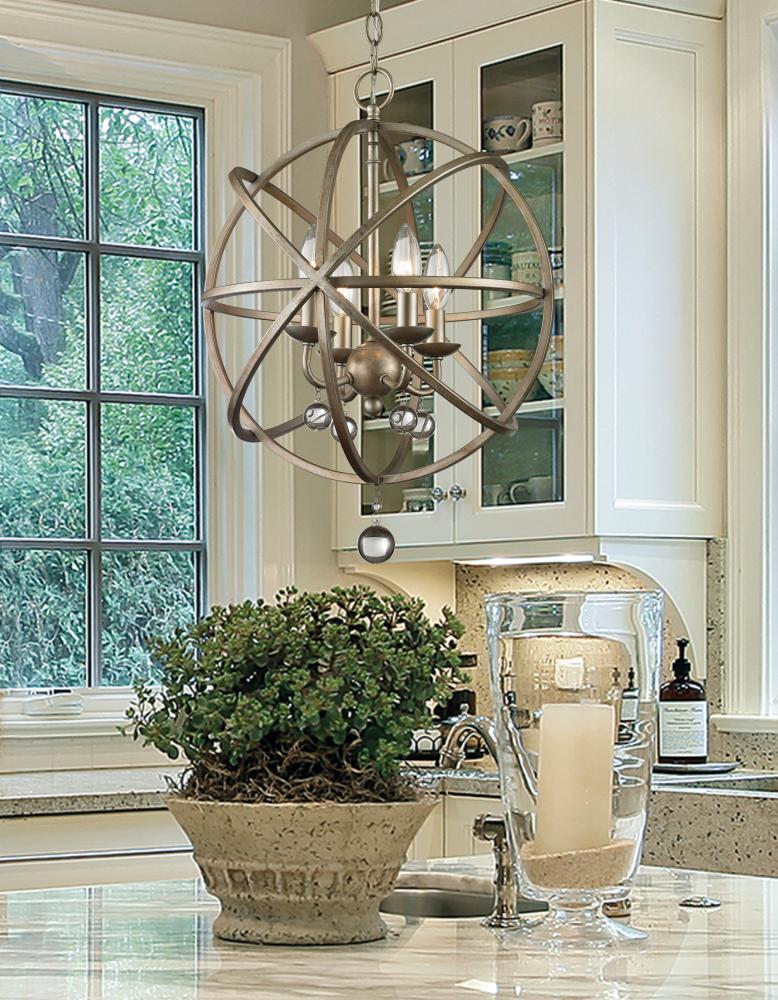Spherical art at its best! On this 4 light pendant, the rich hues of the antique silver finish mingle playfully with the crystal spheres sparkling from within.