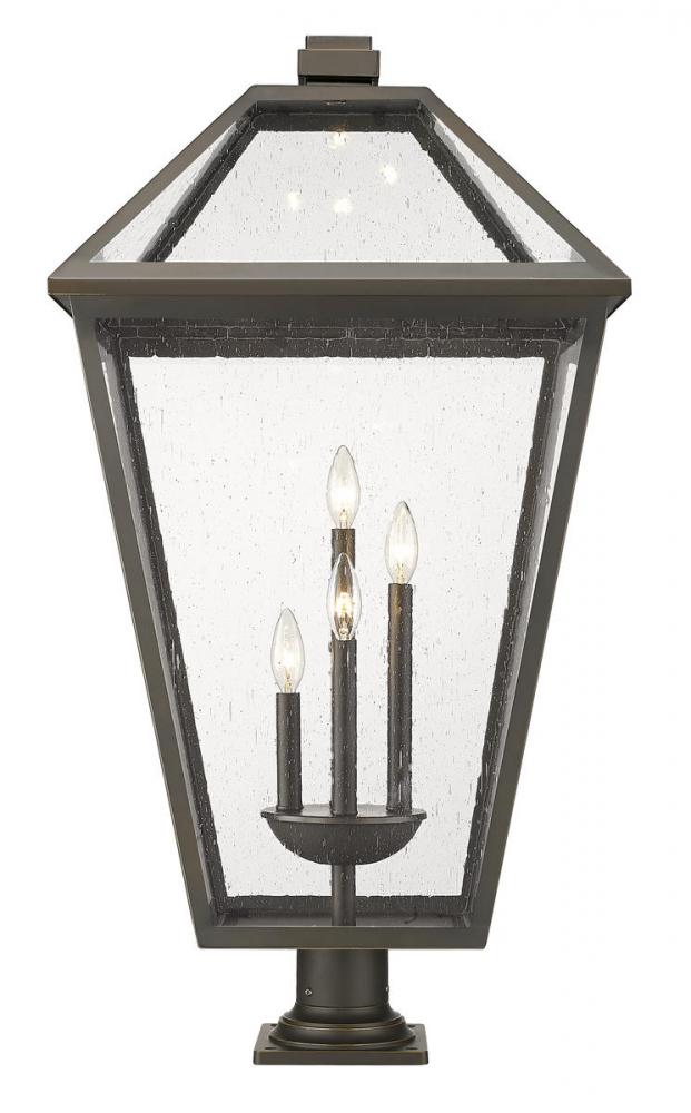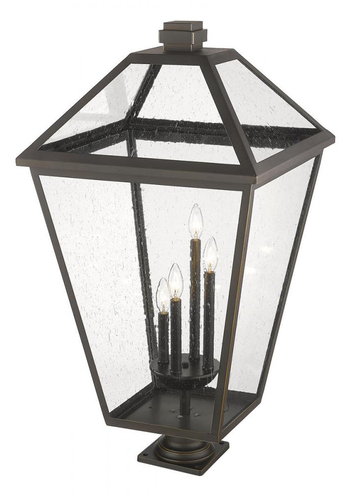 Walkways and garden spaces invite aesthetically pleasing light fixtures, and the Talbot four-light outdoor pier mounted fixture offers a sophisticated way to showcase treasured exterior areas. This fixture and base deliver a charming village-inspired look with a lantern silhouette. A midnight black finish stainless steel frame is enhanced with clear glass panels showing slender bulb mounts.