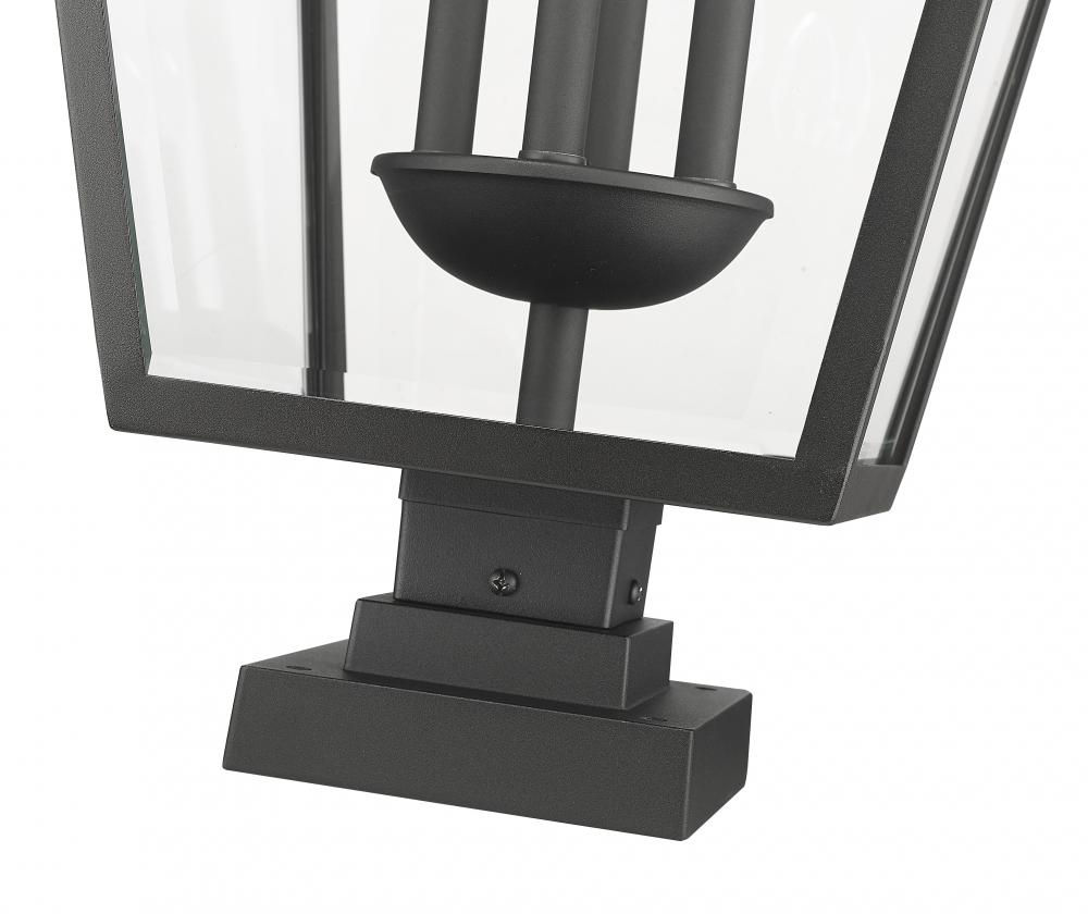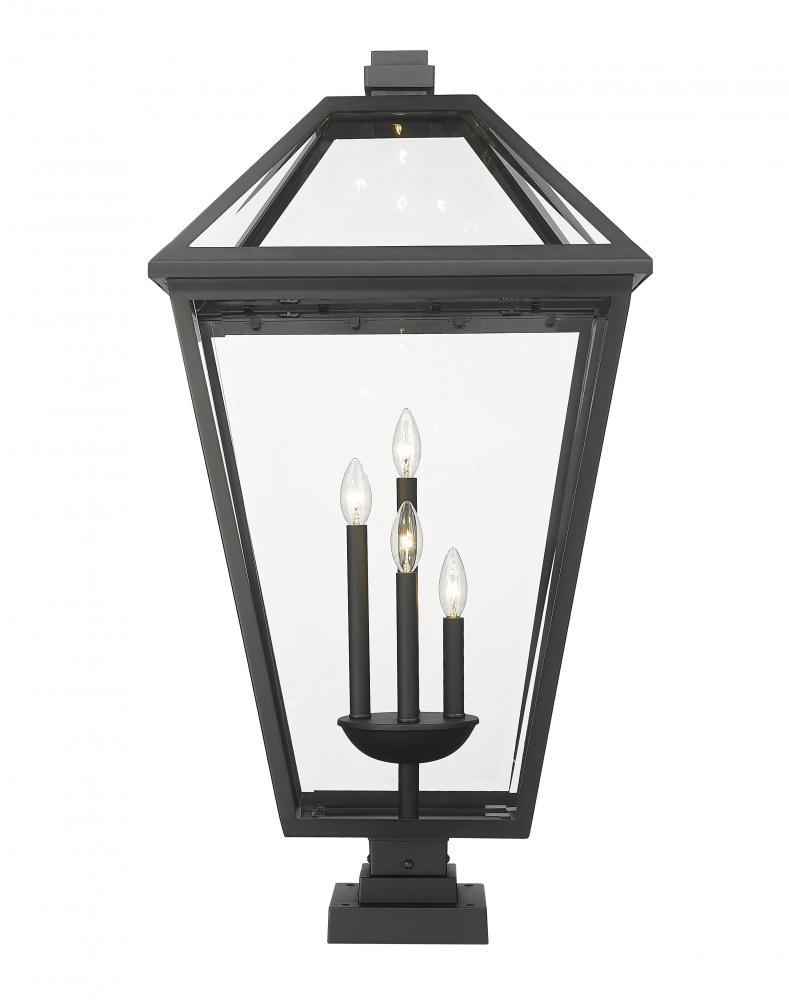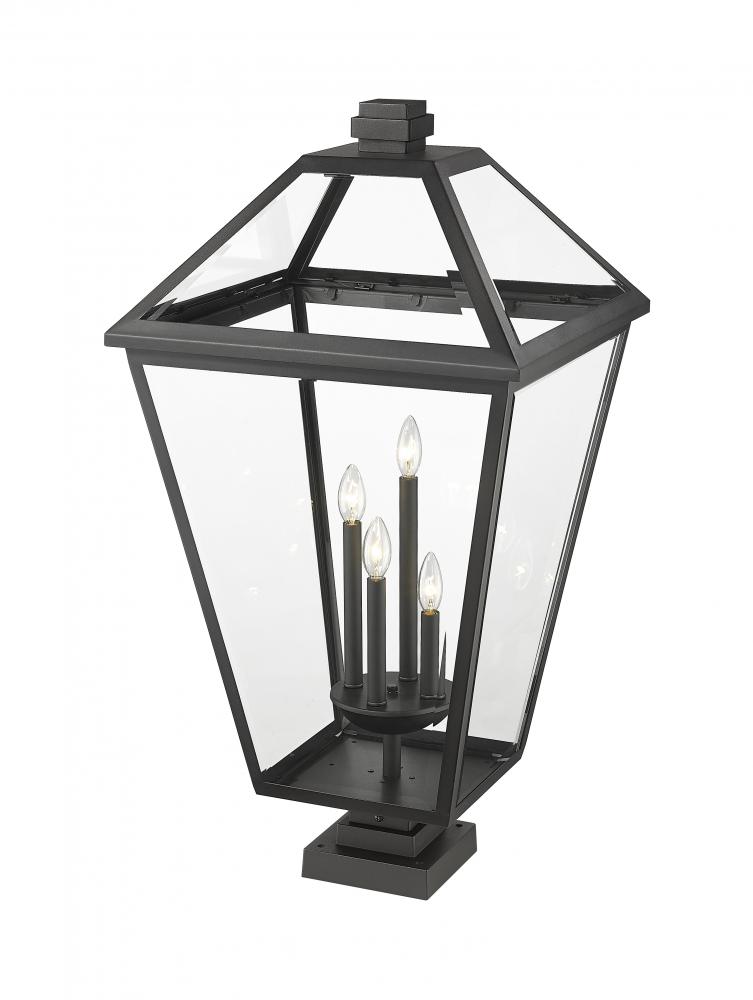 Careful landscape design efforts deserve embellishment, and the Talbot four-light pier mounted fixture delivers in a big way. A charming village motif infuses industrial-transitional style, blending a lantern silhouette frame and pier crafted of midnight black finish stainless steel with a matching interior bulb cluster mount. Tapered clear glass panels offer a tasteful modern transparency.