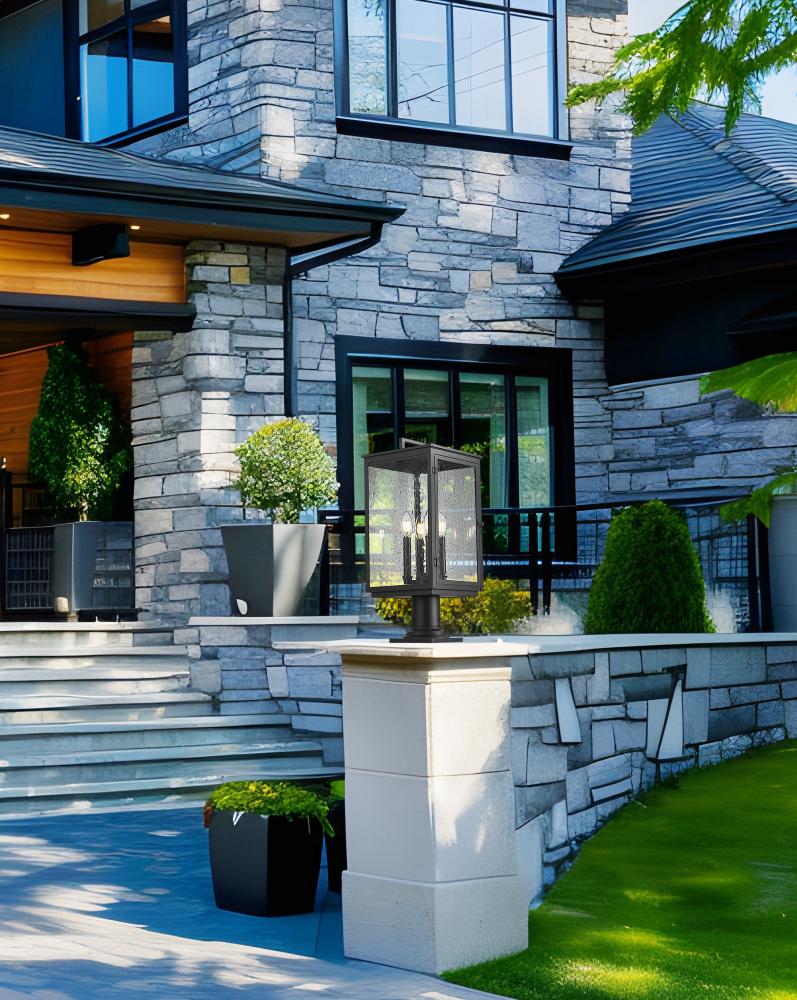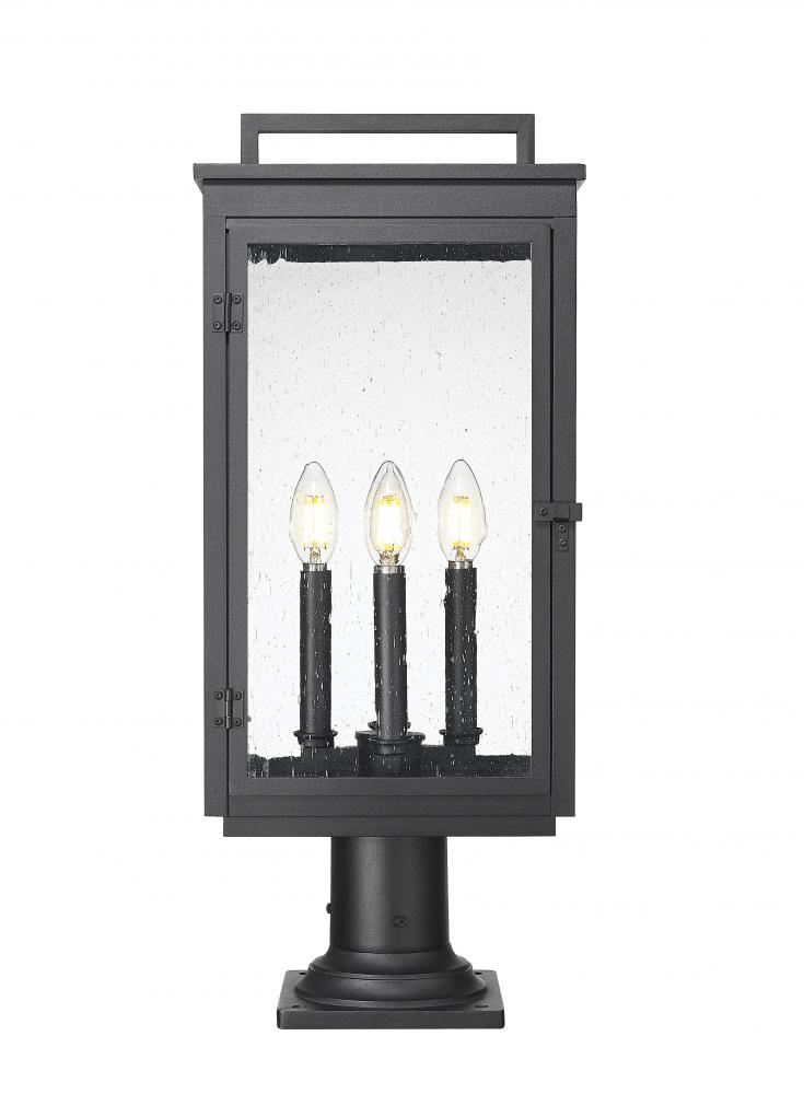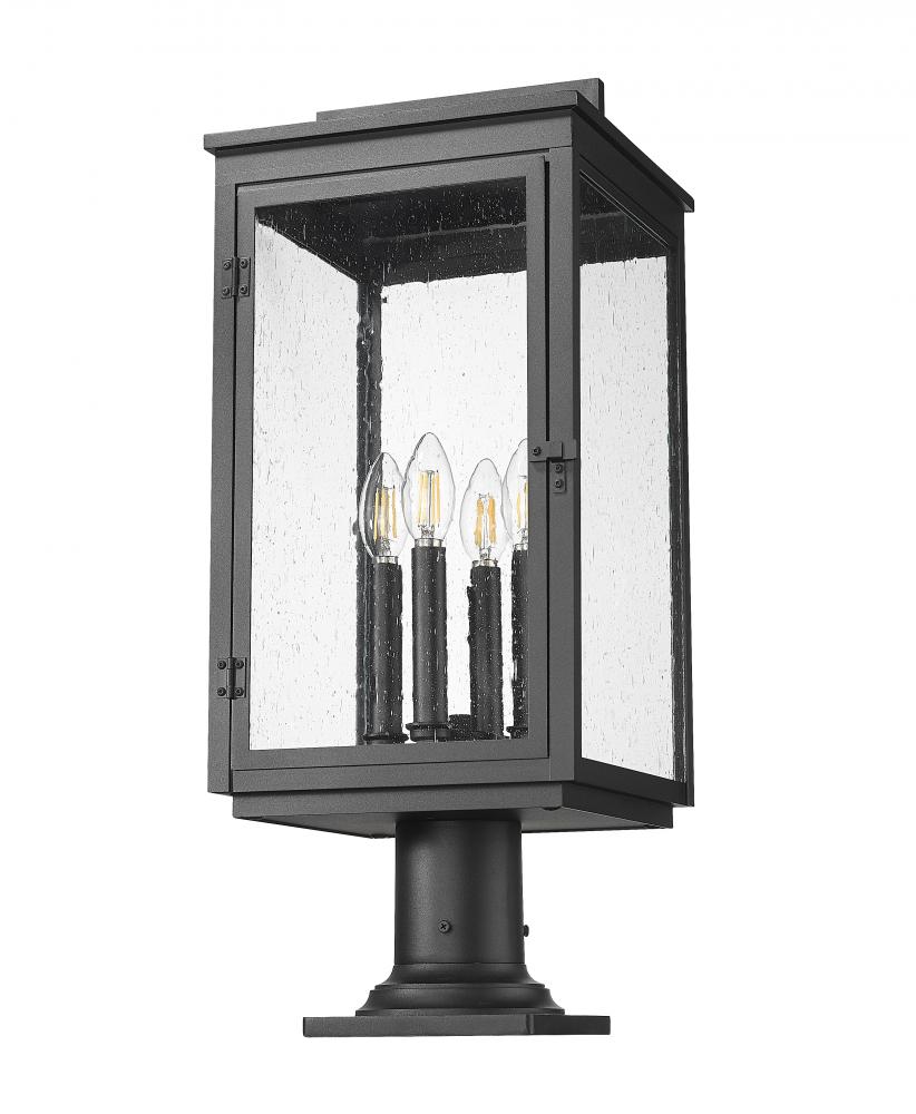 Charming candles behind clear seedy glass radiate light and character in this Mission four-light outdoor pier-mount fixture. Perfect for decks and pathways, it features a marine-grade sand black finish over aluminum framing, offering timeless allure to your porch or patio.