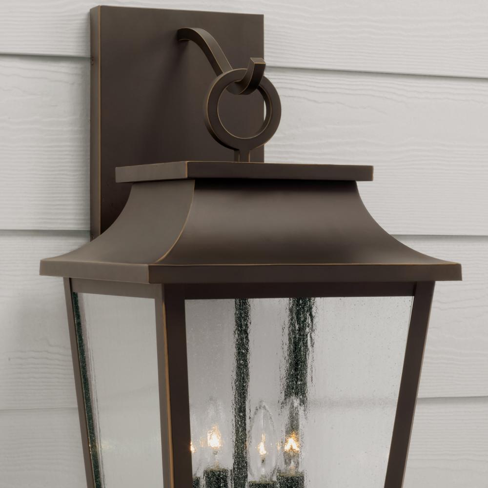 Take the charm outside with the Chandler Outdoor Wall Lantern. The Oiled Bronze finish accents the curved lines and ring detail atop the tapered frame, while the Antiqued Glass creates a unique glow. Part of our Rain or Shine Series and backed by our five-year warranty.