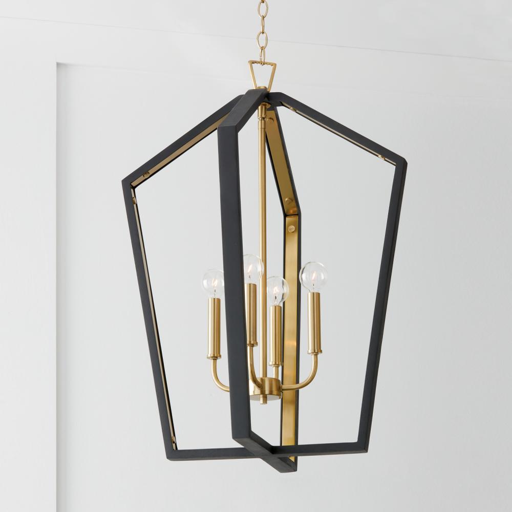 A sleek silhouette and intriguing details define the Maren Pendant. The bands of Matte Brass metal line the interior of the flat black painted mango wood, creating an unexpected detail on the intersecting arms and casting a warm glow on the open-air frame.