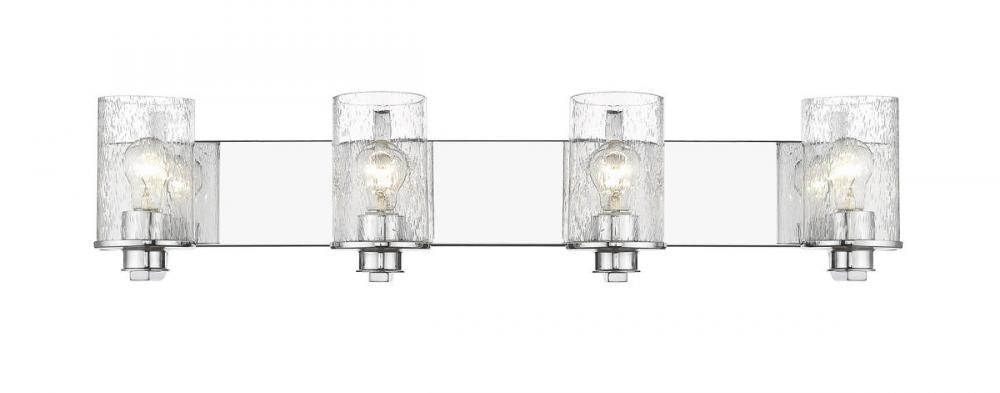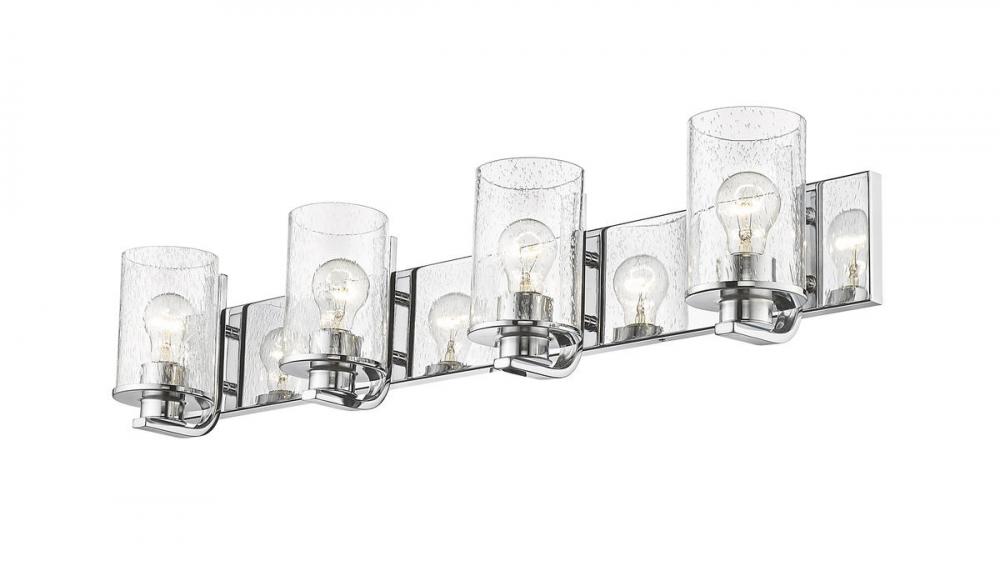 This four-light vanity light from the Beckett collection offers a minimalist look with customized materials. Create a sophisticated aesthetic in a mid-sized bath or dressing space with a fixture formed of bright chrome finish steel and highlighted with the romantic look of cylindrical clear seedy glass shades.