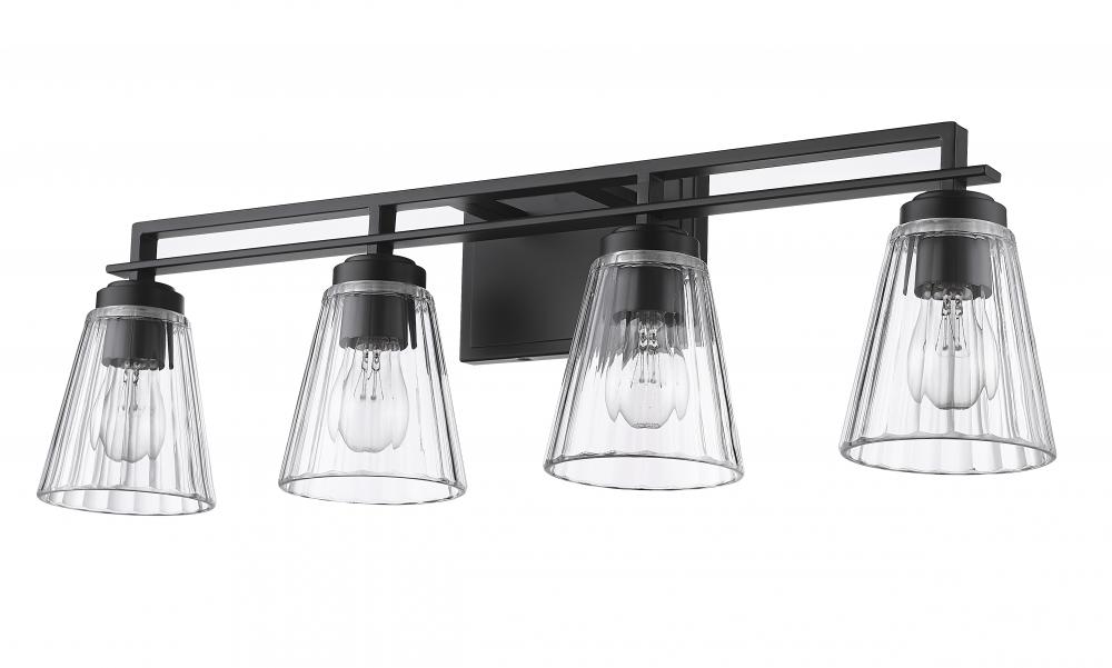 A generous width and upscale aesthetic go a long way toward highlighting an ensuite or guest bath vanity with a four-light vanity light from the Lyna collection. This chic fixture reflects a touch of nautical charm and embodies the importance of symmetry and style. A linear frame fashioned of bold matte black finish steel supports four glam clear ribbed glass cone shades, delivering an uncompromising level of romantic essence.