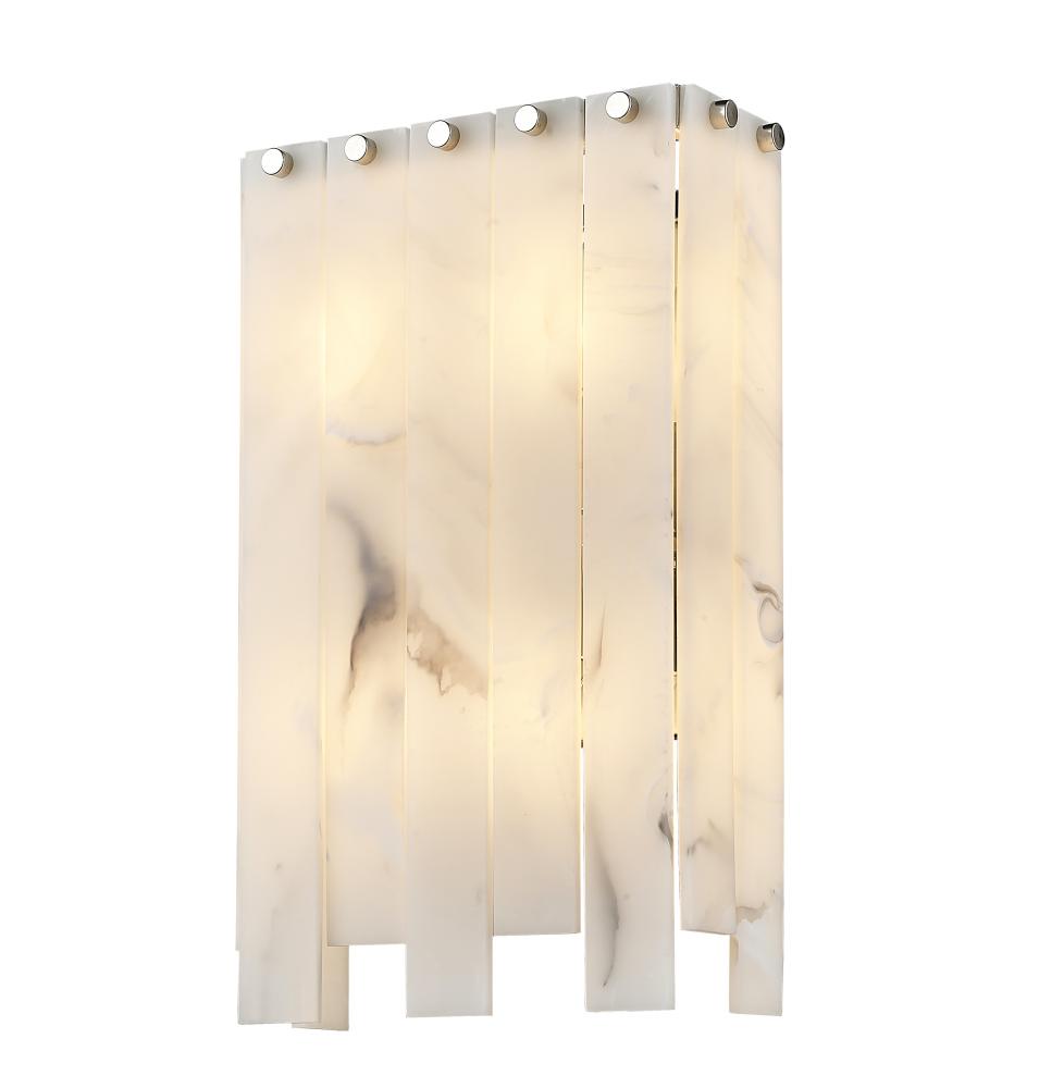 Strive for eye-catching artistry in the mode of Art Deco as you outfit a custom space with ambient and accent lighting. This four-light wall sconce from the Viviana collection creates impact with alabaster-like strips alternating in length and arranged around a rectangular polished nickel finish steel frame. Dressed up with whimsical rivot detailing, this sconce goes with the flow as it complements a gritty rendition of toned-down glam in a main living setting, en suite, or bedroom.