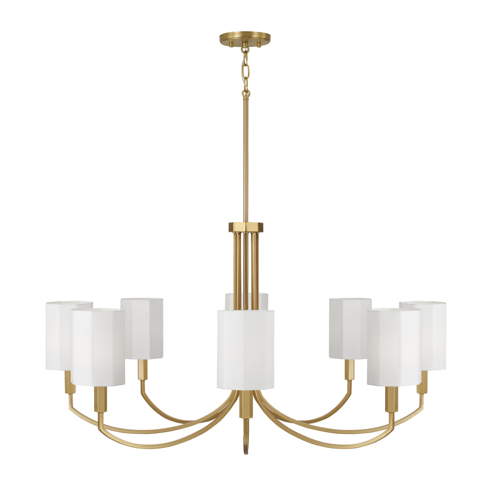 Geometrically inspired, the Adrian Large Chandelier brings a structural silhouette with high style. The White fabric octagonal shades and faceted candle sleeves create striking dimension, while the Aged Brass finish adds a classic touch.