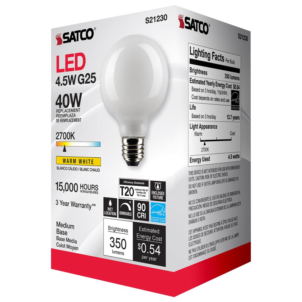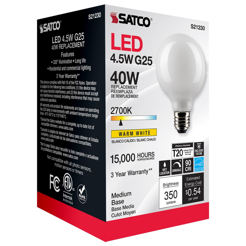 Satco's S21230 4.5-watt LED lamp is traditional, yet contemporary with its sleek finish and energy saving LED technology. Elegantly illuminate any room in the house with this dimmable, globe shaped bulb. Sophisticated and modern, this lamp delivers 15,