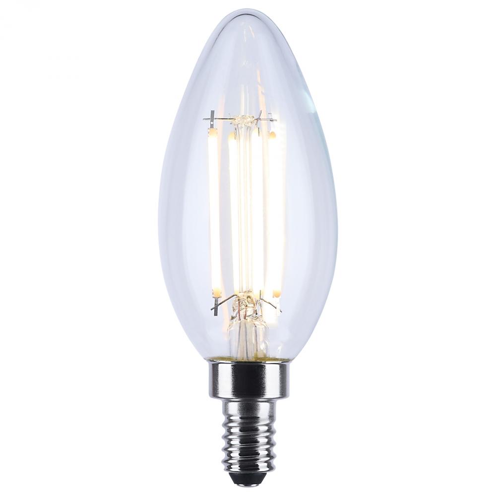 SATCO NUVO's S12157 B11 Dim to Warm filament bulb offers a candle-like appearance with advanced dimming from 3000K to 2000K. Featuring a clear glass finish and E12 candelabra base, it's ideal for chandeliers, sconces, and accent lighting. With 360