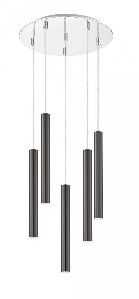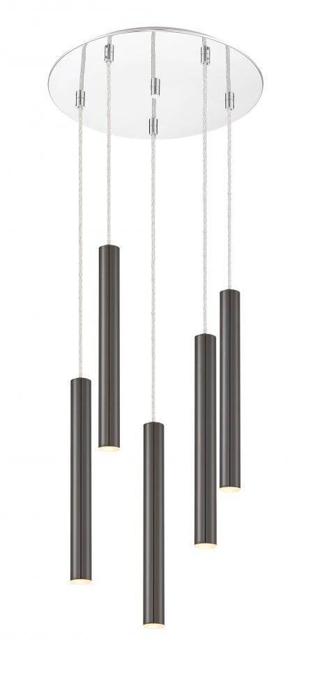 The windchime-inspired silhouette of this five-light pendant light is stunning in a living room. The modern silhouette features a pearl black finish and elongated details.