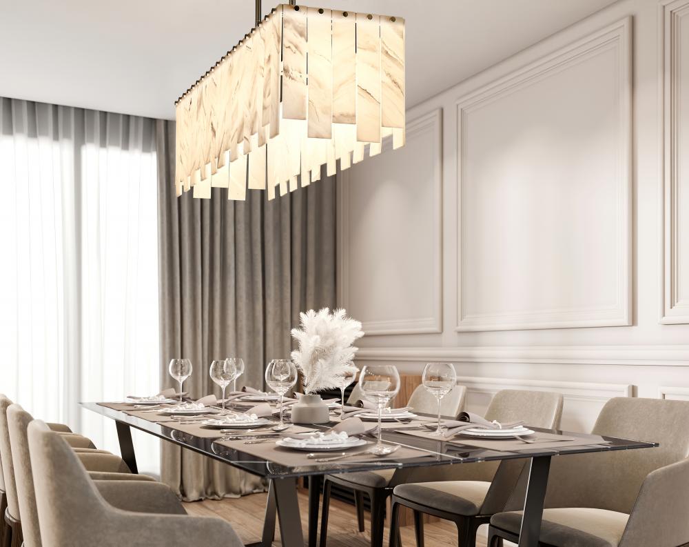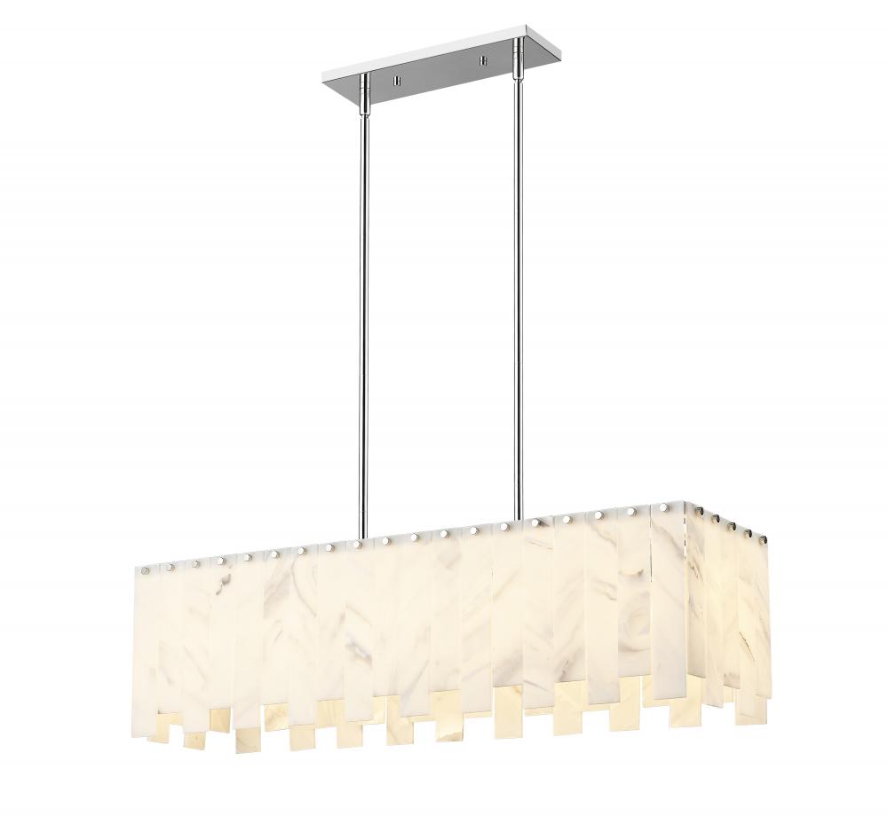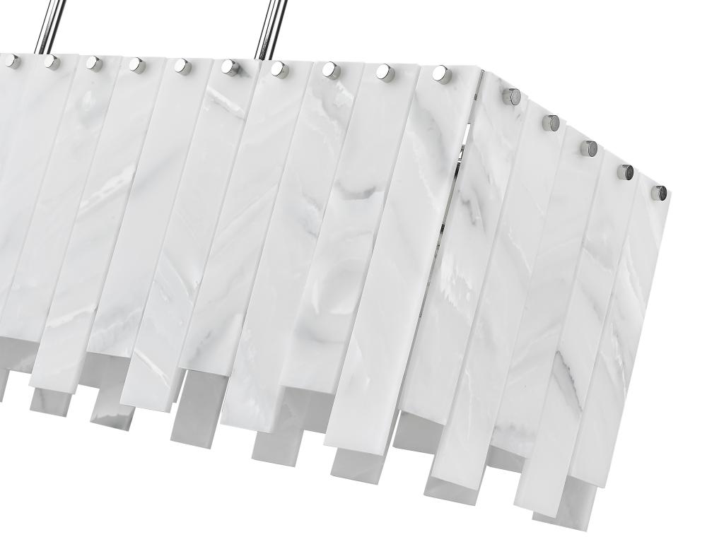 From the Viviana collection comes a bit of Art Deco influence with gallery style in an island light with promise. Featuring tasteful alabaster-like strips alternating in length and arranged around a rectangular steel frame, this five-light island light delivers a versatile yet decadent look. Charming polished nickel finish rivot detailing elevates this gallery inspired island light that goes with the flow as it complements a gritty rendition of toned-down glam in a modern kitchen or entertaining setting.