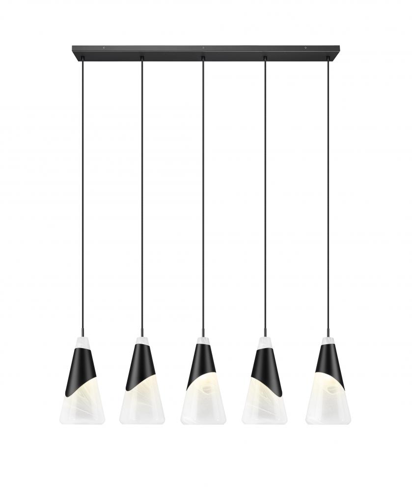 Blending distinctive design elements creates a compelling profile for this modern five-light linear chandelier for a kitchen island or dining table. It shows off a crisp matte black finish that assures timeless character, and pairs it with icy swirled artisan glass shades that add refined sophistication. A slim canopy design anchors the design, while the delicate curves of its metal shroud accents create a sense of fluid movement.