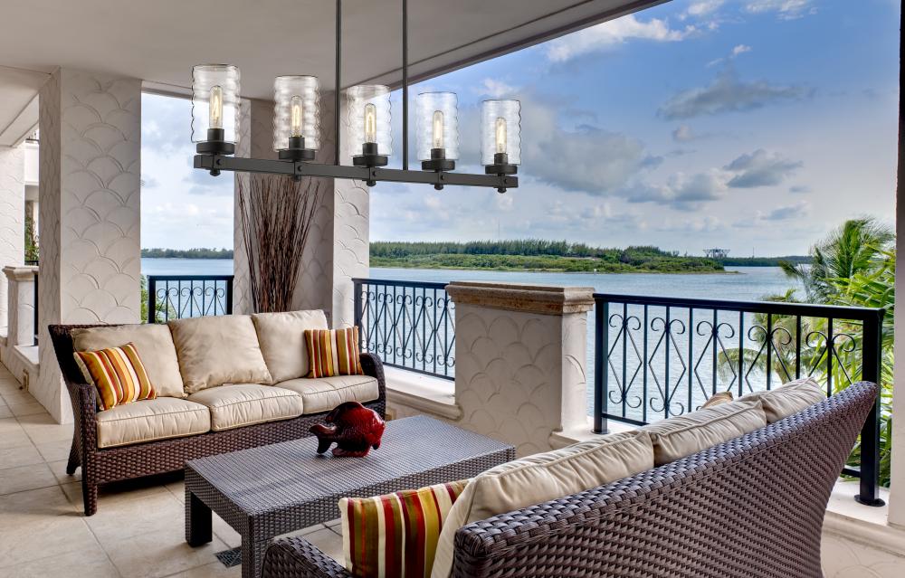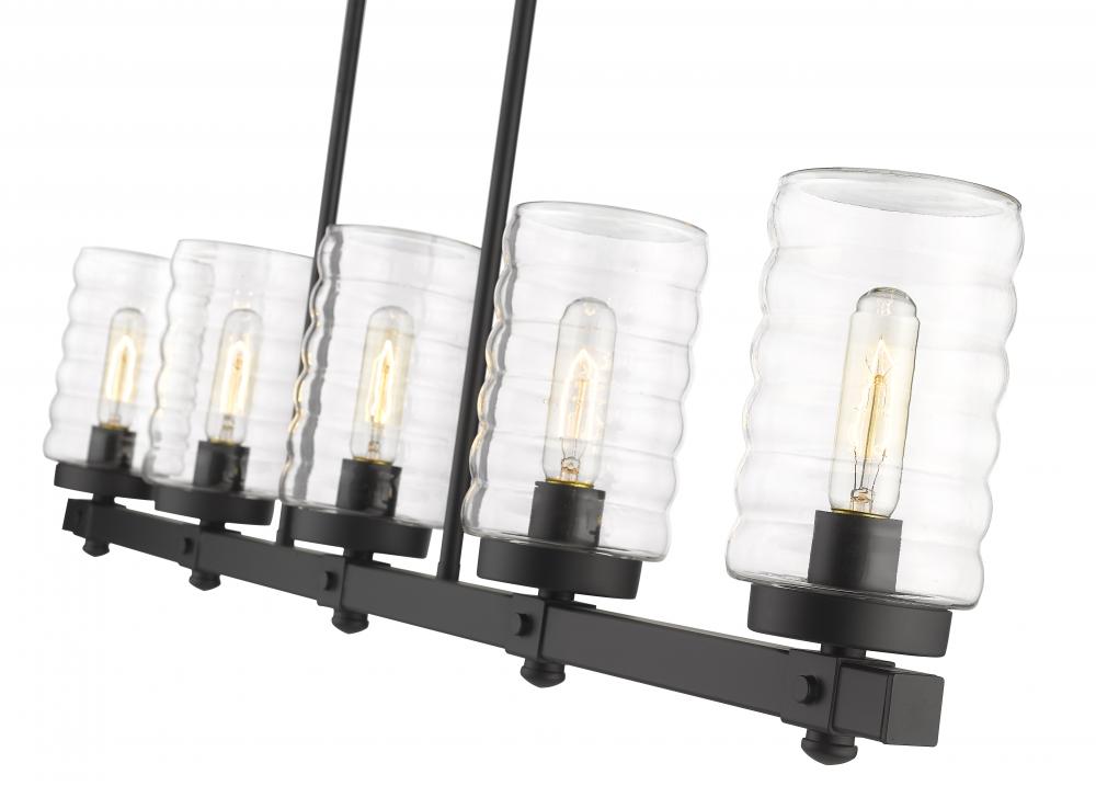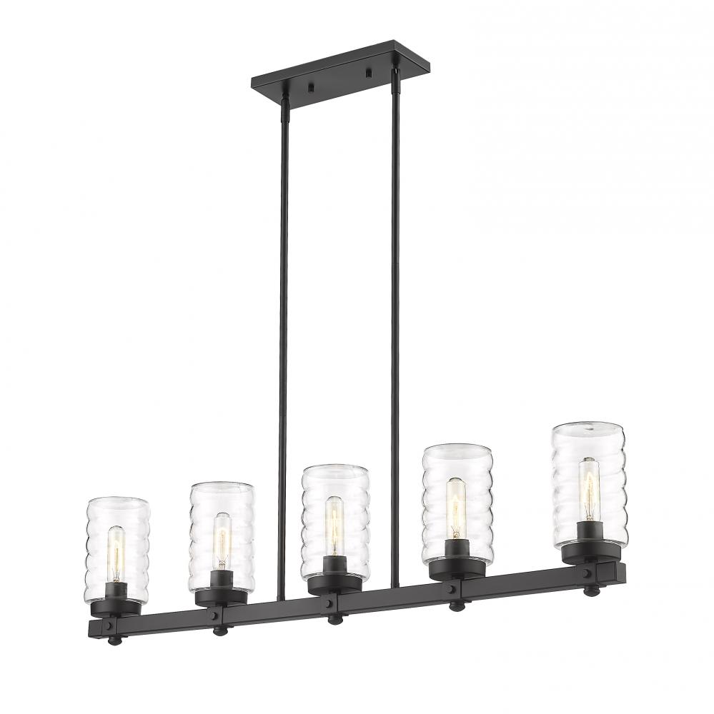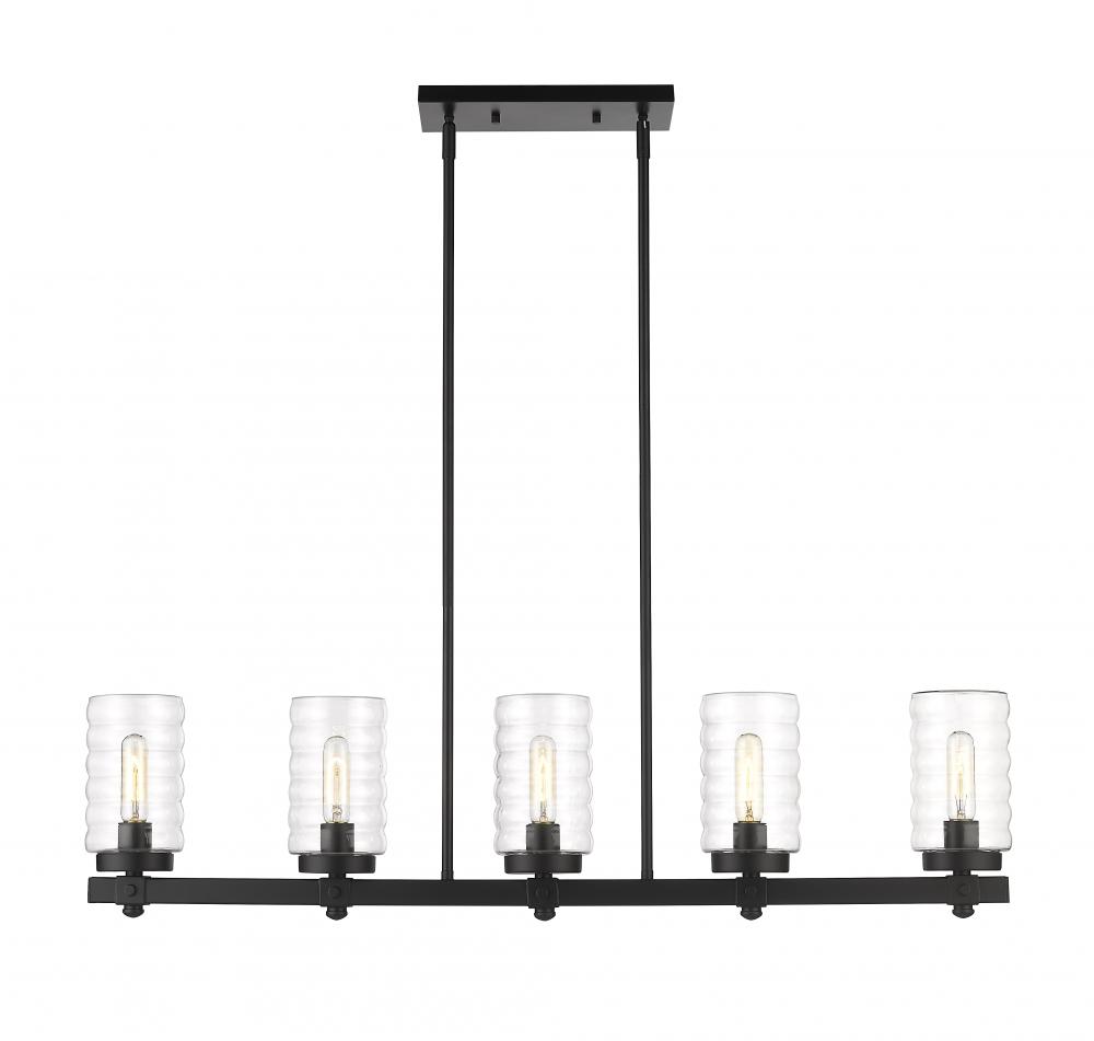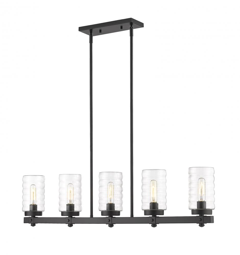Assemble an exterior entertaining space with equal fashion enjoyed by indoor design schemes. The Tahoe five-light outdoor linear island light creates a cluster of charming jar-like clear cylindrical shades, arranged evenly over mounts, a frame, and accents made of matte black finish steel. Silhouetting reflects a clean minimal motif with industrial influence.