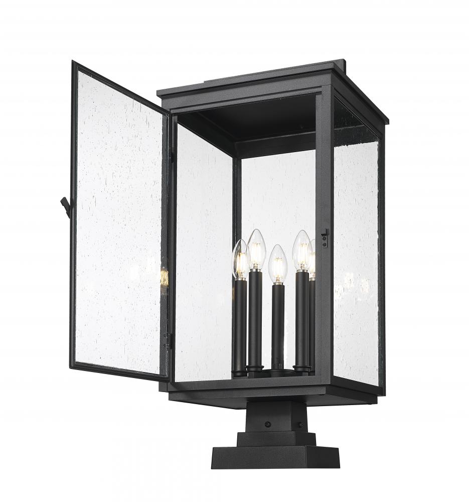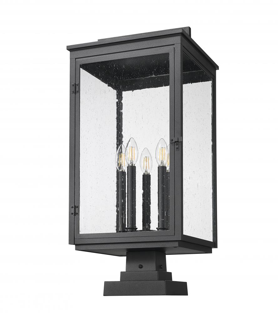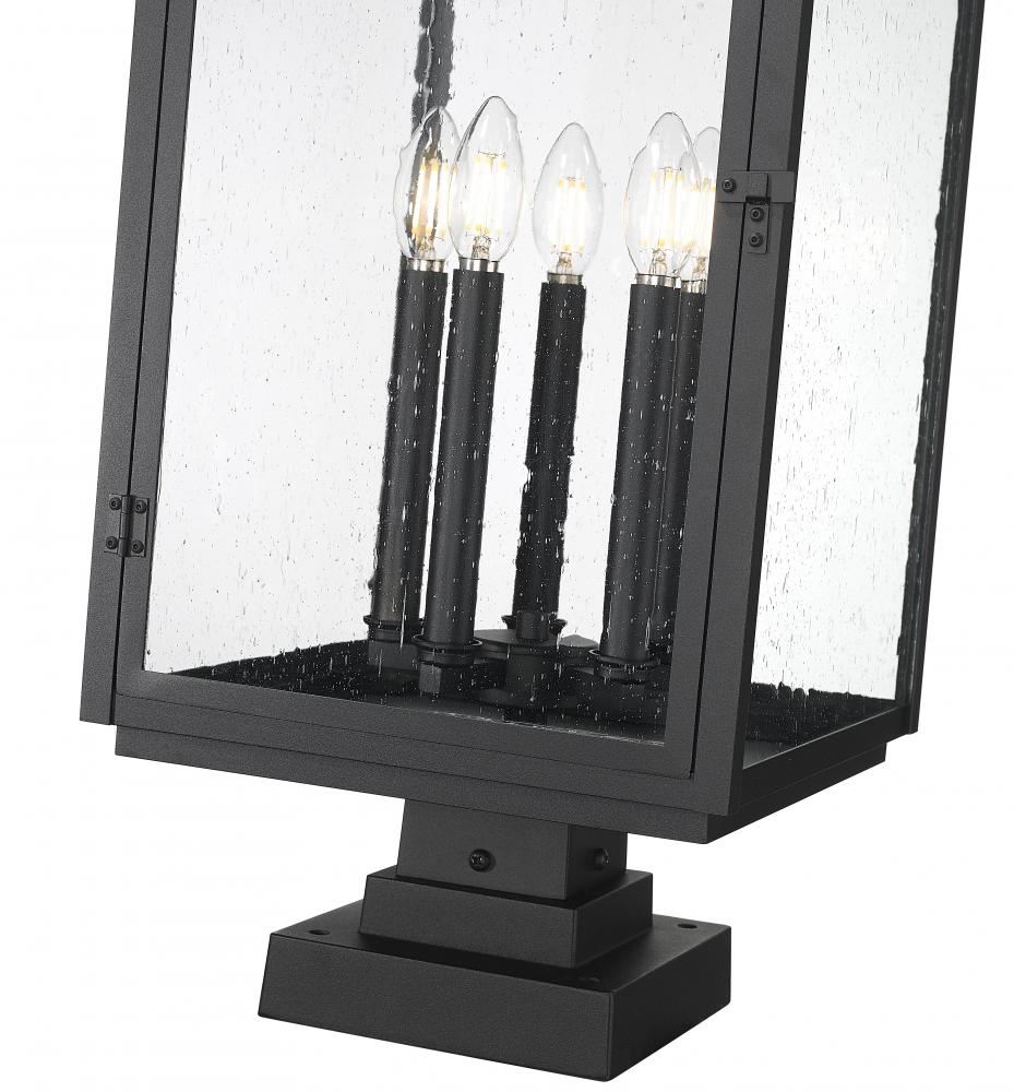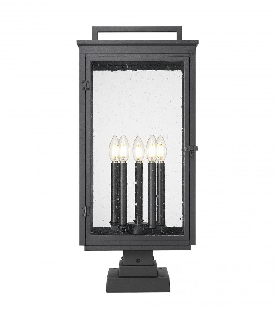 Capture inviting aesthetics with this traditional Mission five-light outdoor pier mount fixture. Clear seedy glass panes enclose its candelabra cluster of lights, while a textured sand black finish is rated for durability in any environment. A clean, simple post completes the look with flawless elegance.