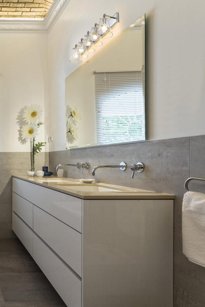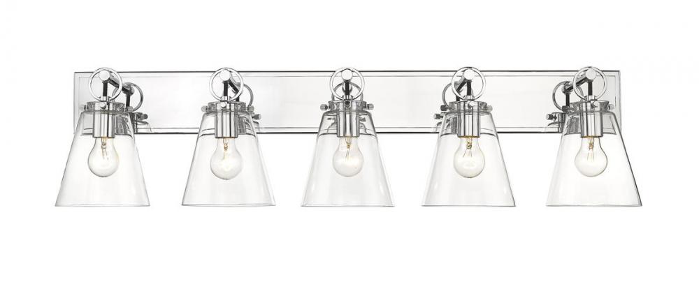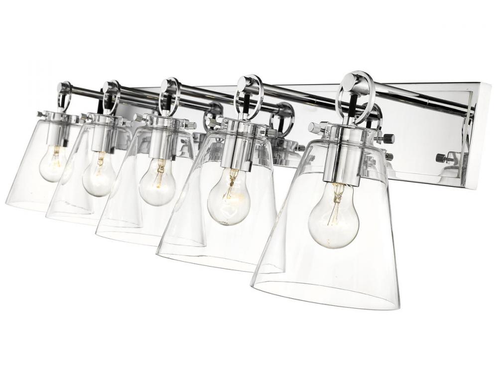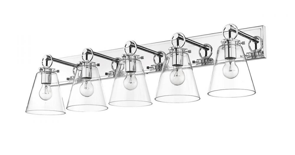Graceful elegance follows linear styling to deliver a fashionable way to illuminate a contemporary bath space. This five-light vanity light from the Harper collection offers inspiring nautical charm with upscale materials and finishes. A radiant chrome finish steel wall mount and ring and peg accents add whimsical vibes to five delicate conical shades fashioned of sleek clear glass.