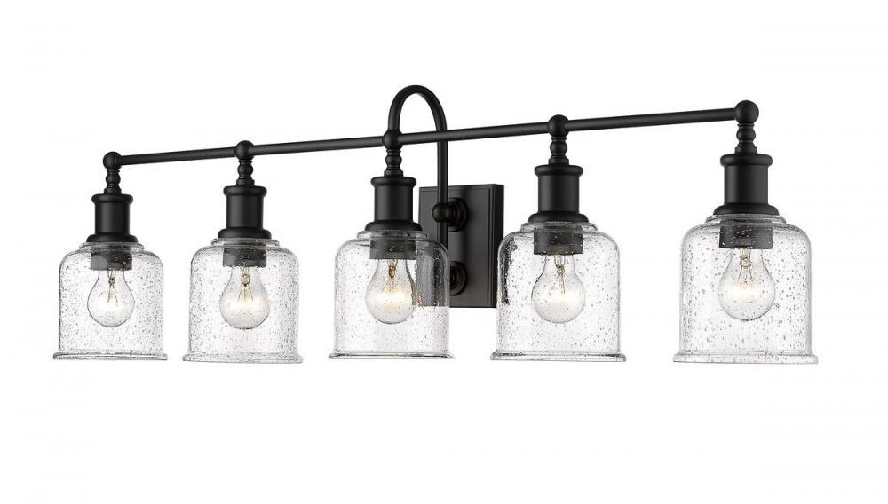 Add fashionable lighting to a master or guest bath space with this stylish five-light vanity light from the Bryant collection. A gooseneck arm pads the vintage nautical aesthetic of this chic light that features a frame and holders made of bold matte black finish steel. Lipped clear seedy glass shades continue its soft style and add an artful emphasis.