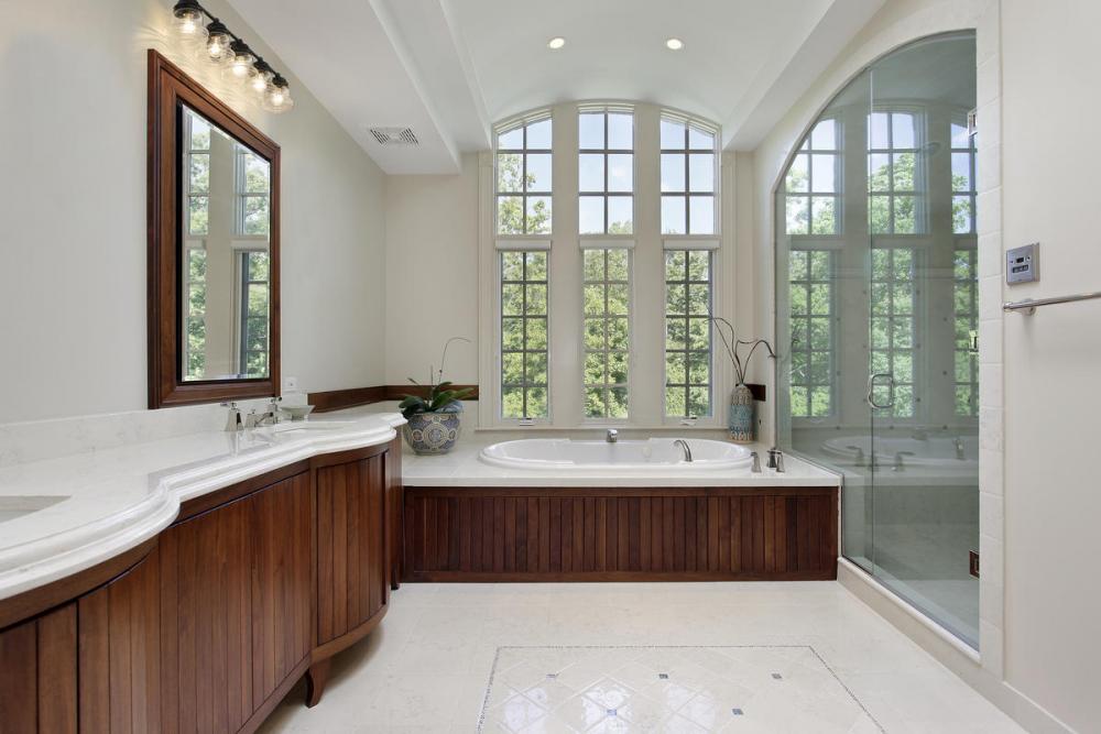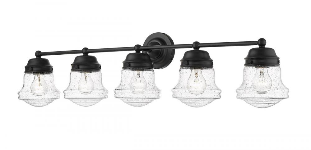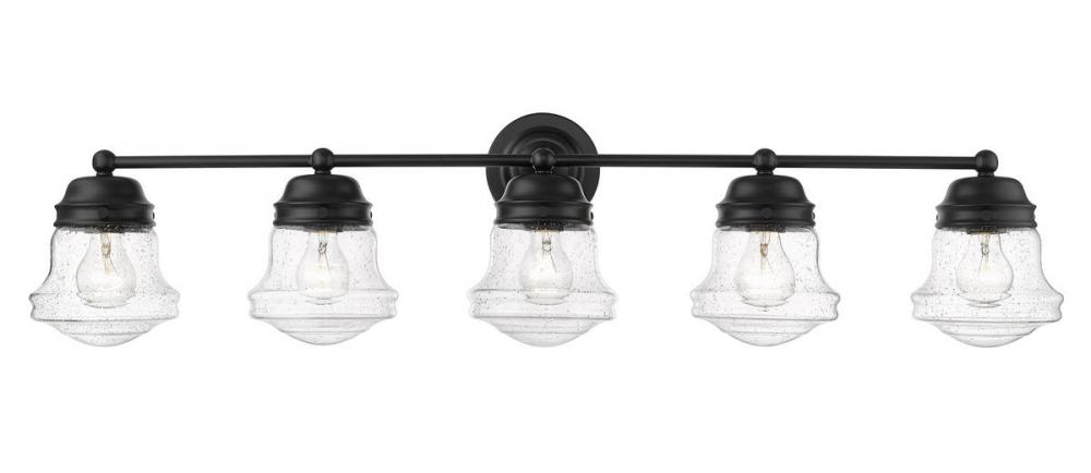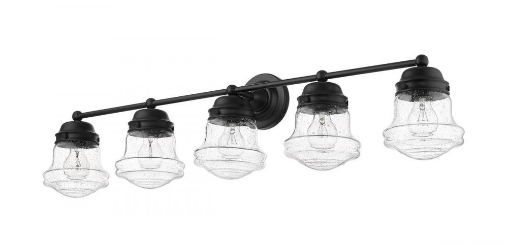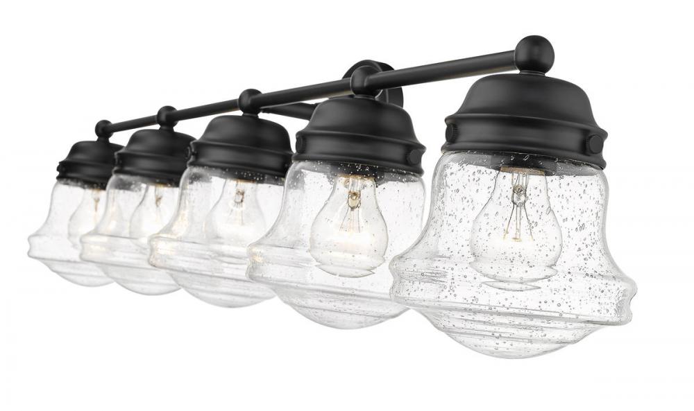 A large vanity calls for big style, and this transitional five-light bath vanity light delivers. With a charming village industrial motif, it incorporates a bit of nautical attitude and contrasts bold matte black steel with unique schoolhouse style shades made of romantic clear seedy glass. This light from the Vaughn collection transforms the overall aesthetic of any bath space.
