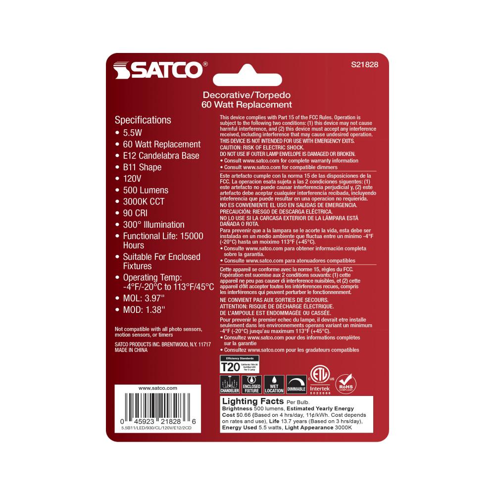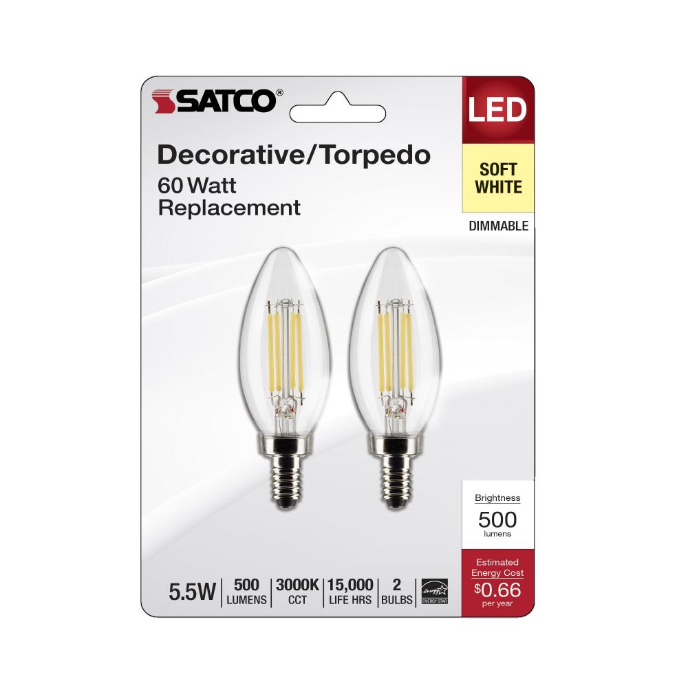 Satco's 5.5-watt, LED B11 bulb with a candelabra base is dimmable, offers soft white light, and a 300 degree beam spread. Wet location rated for kitchens and bathrooms, the carded 2-pack is suitable for retail display. Elegant and long-lasting, this cl