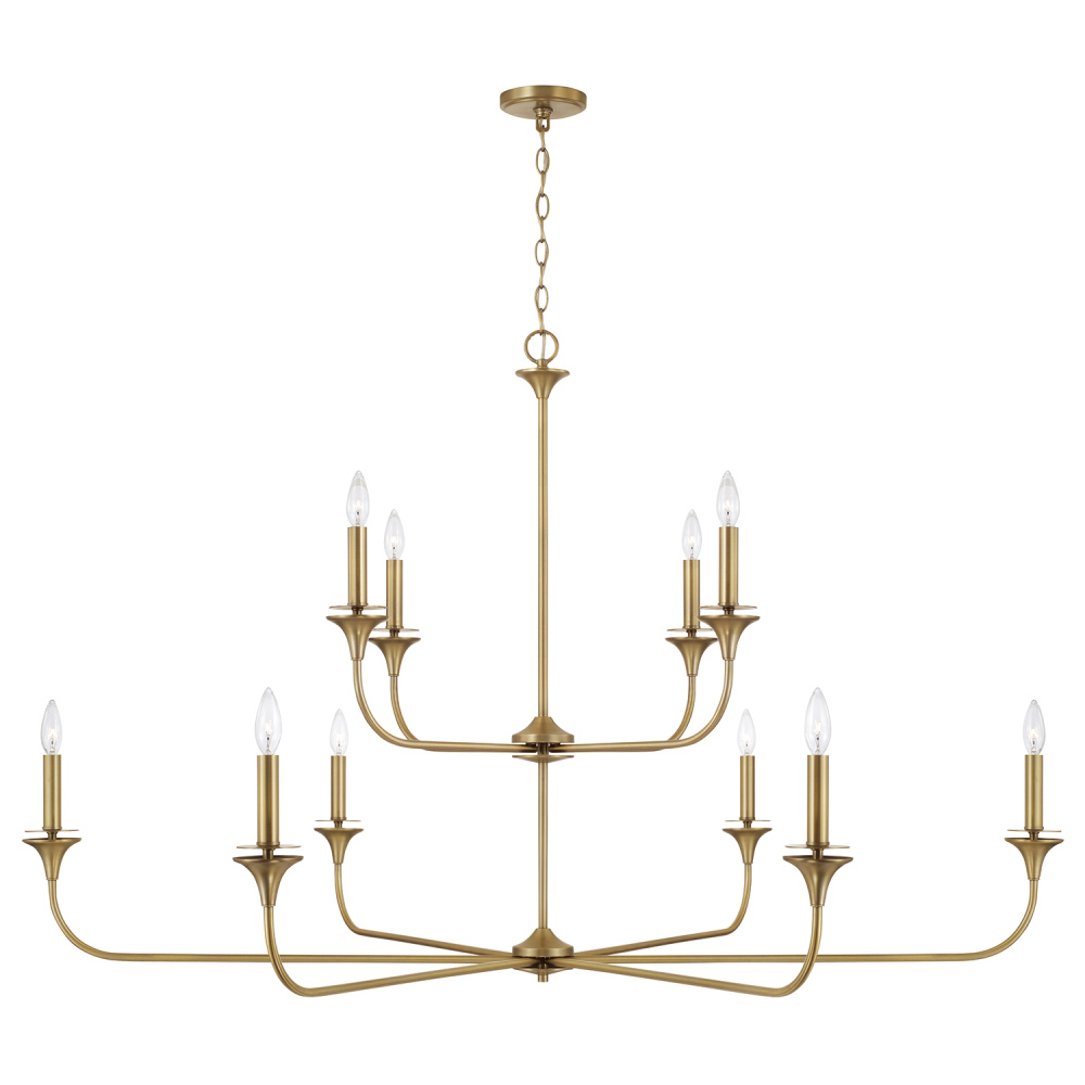 Featuring sleek contours and flared accents, the Presley 10-Light Two-Tier Chandelier for HomePlace brings high design to every home. The Aged Brass finish invites a classic aesthetic that mixes with any style.