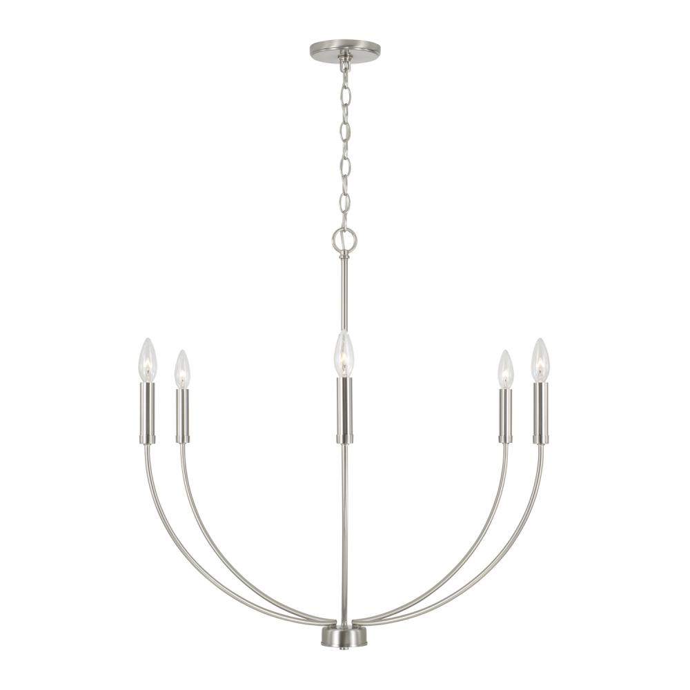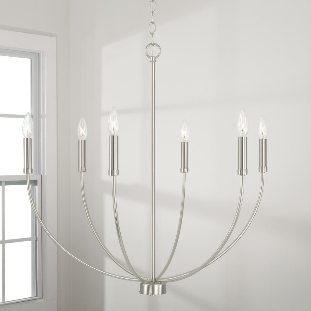 A classic shape refreshed with sleek contours and sweeping curves, the Ansley 6-Light Chandelier for HomePlace makes a statement that suits every style. The elongated arms and open silhouette invites standout style that doesn't overpower, while the Brushed Nickel finish creates a versatile aesthetic.
