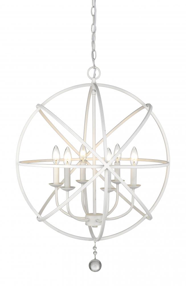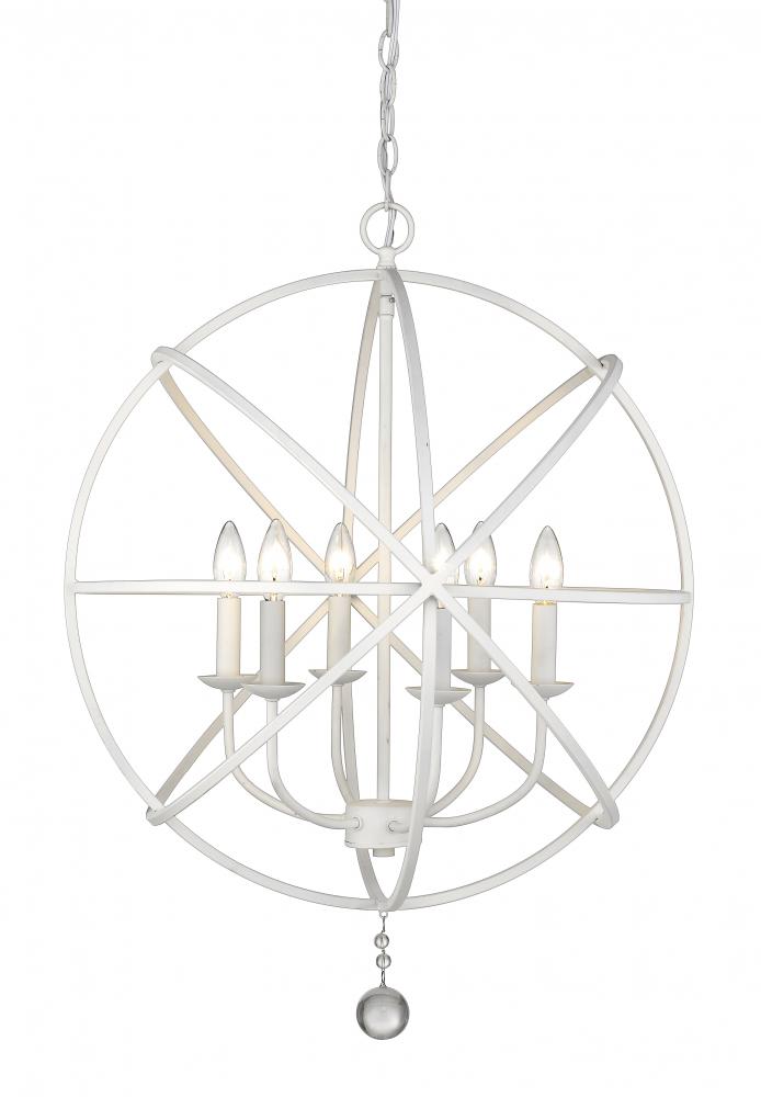 Attention-getting and freshly styled, this matte white six-light chandelier presents a fashionable mix of space-age modern style and charming traditional romance. Choose custom finishes to grace its interior frame, finials, and candelabra bulb bases, and enjoy the delicate look of dangling crystals that complete its design-forward look.