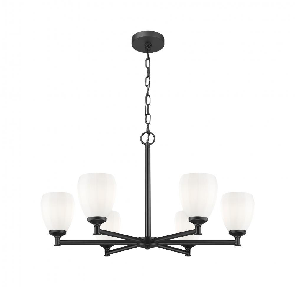 Brighten your entry or dining room with the understated style of a modern classic six-light chandelier. In matte black, it delivers rich contrast and depth while offers bright, diffused illumination. Shades evoke tulips, complete with faceted details that add unique character to their matte opal glass construction.