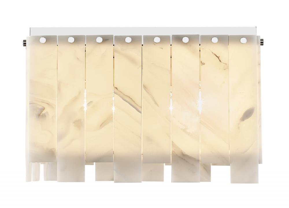 A bit of glam style goes a long way in both lighting and aesthetics. This six-light flush mount ceiling light from the Viviana collection creates impact with alabaster-like strips alternating in length and arranged around a rectangular polished nickel finish steel frame. Dressed up with whimsical rivot detailing, this flush mount light goes with the flow as it complements a gritty rendition of toned-down glam in a kitchen or entryway.