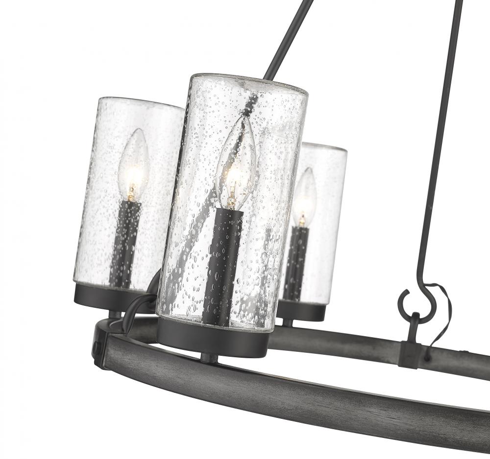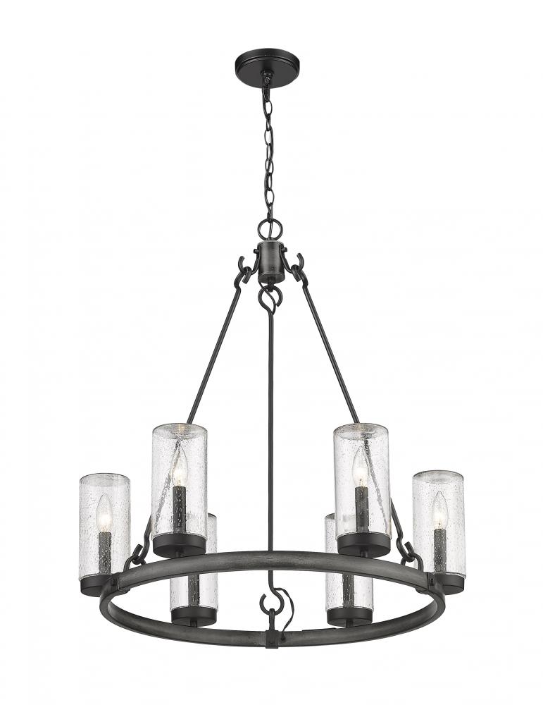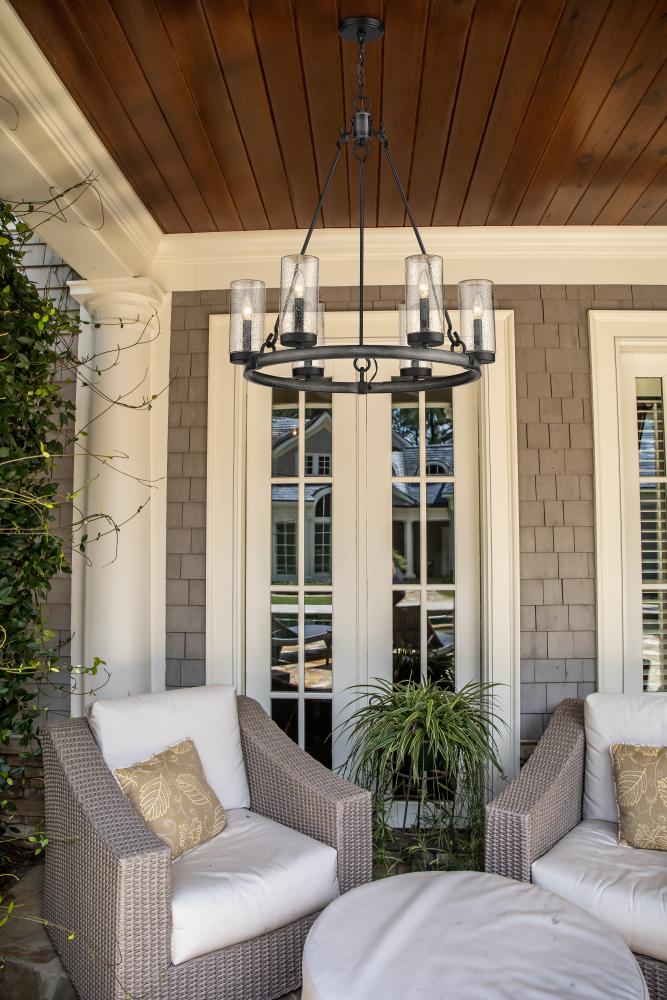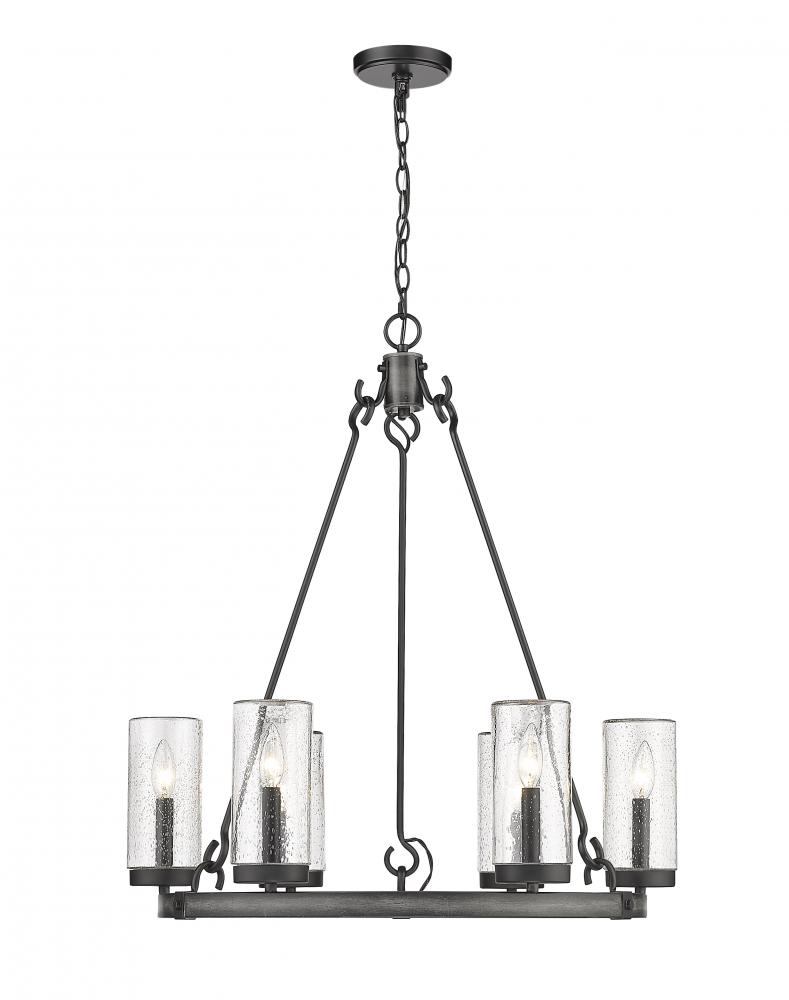 European influence guides the romantic design of the Marlow six-light outdoor pendant, creating an eye-pleasing circular silhouette perfect for a gazebo or covered patio space. Indulge in a theatrical motif with a light fixture featuring an ashen barnboard finish steel frame nestling clear seedy glass cylinder shades. Ornate, intricate detailing speaks to an effort to raise the attitude of any space.