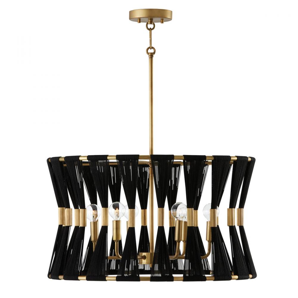 A tapered silhouette, gathered string accents, and a material mix of hand-wrapped Black Rope and slightly distressed painted Brass create contrast, drama and glamour in the Bianca Collection. This show-stopping 6-Light Pendant is available in multiple sizes.