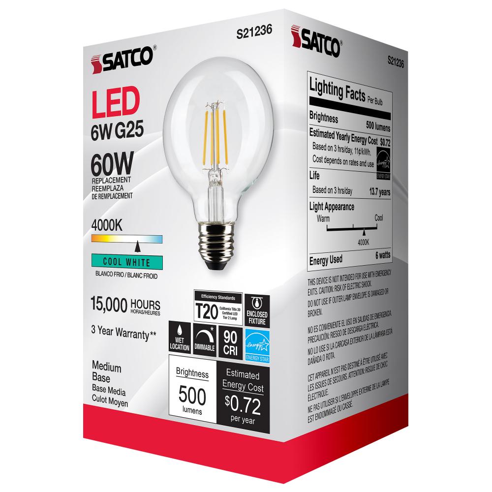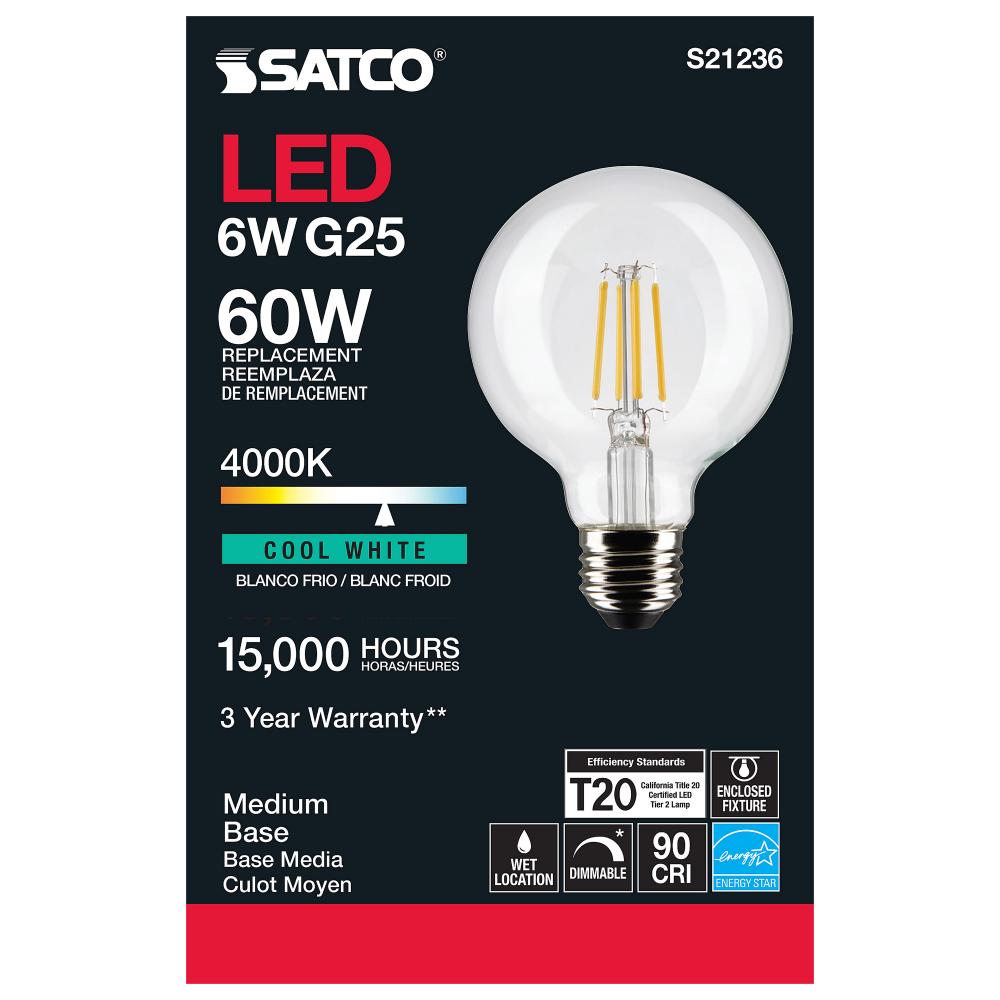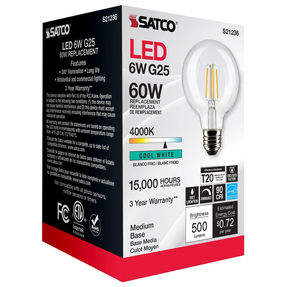 Satco's S21236 6-watt LED lamp is traditional, yet contemporary with its vintage style and energy saving LED technology. Elegantly illuminate any room in the house with this dimmable, globe shaped bulb. Sophisticated and modern, this lamp delivers 15,0