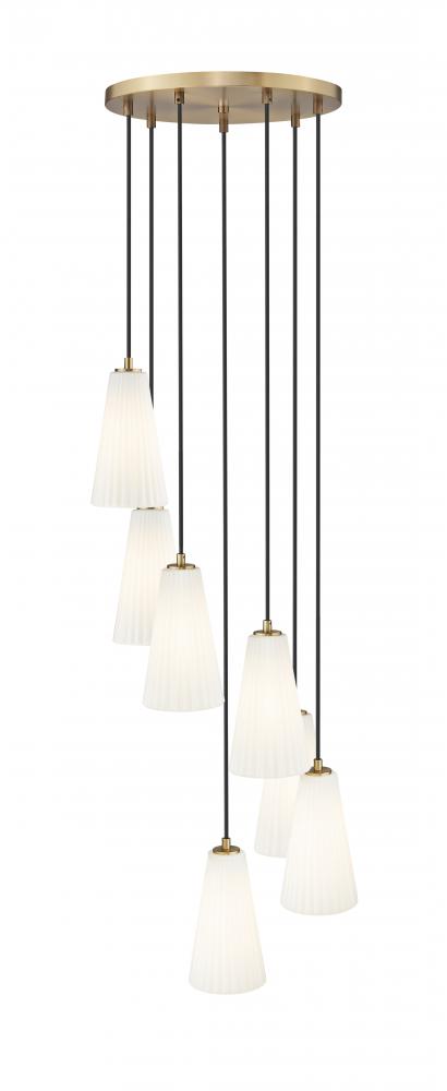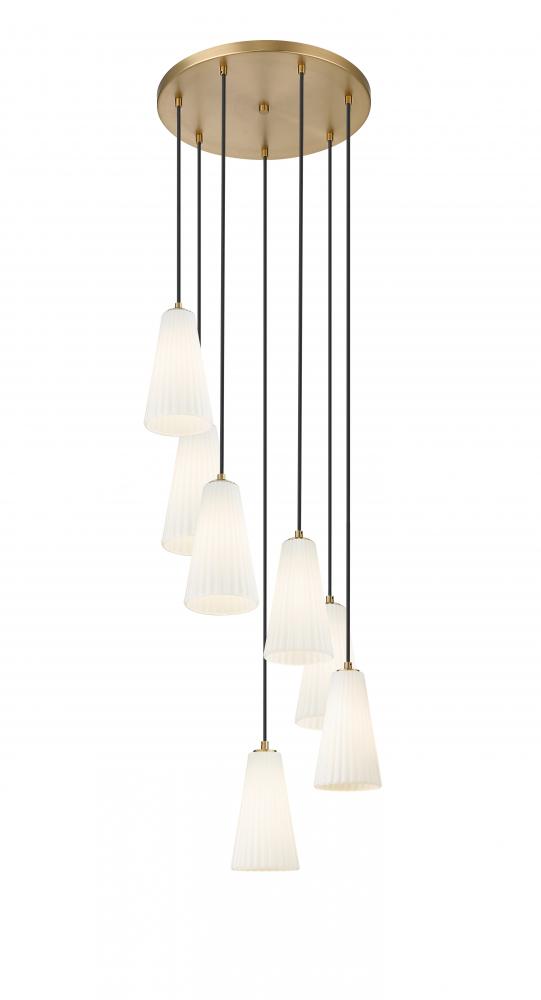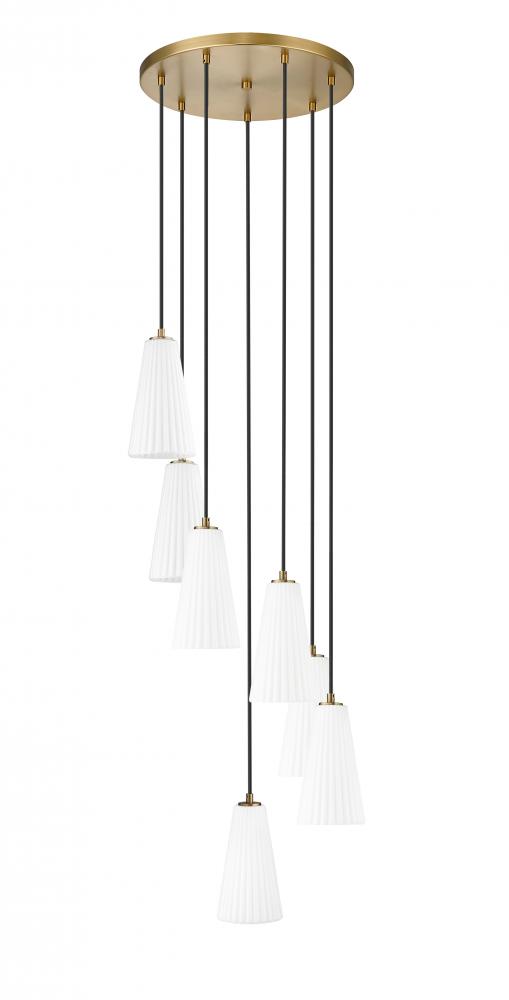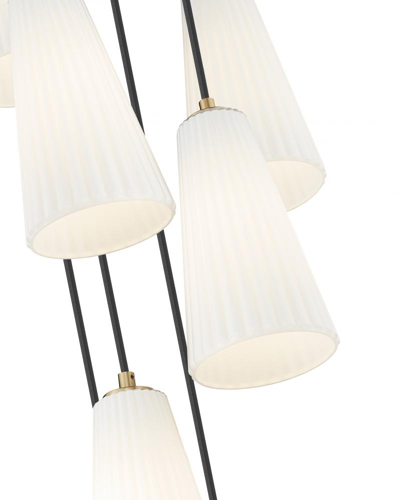 Modern gold brings the perfect touch of warmth to a modern seven-light chandelier. Its spiraling presentation is enhanced with black suspension cords and frosted white glass for diffused illumination. Shades are conical, with fine fluting that adds just the right touch of fluidity and textural depth.