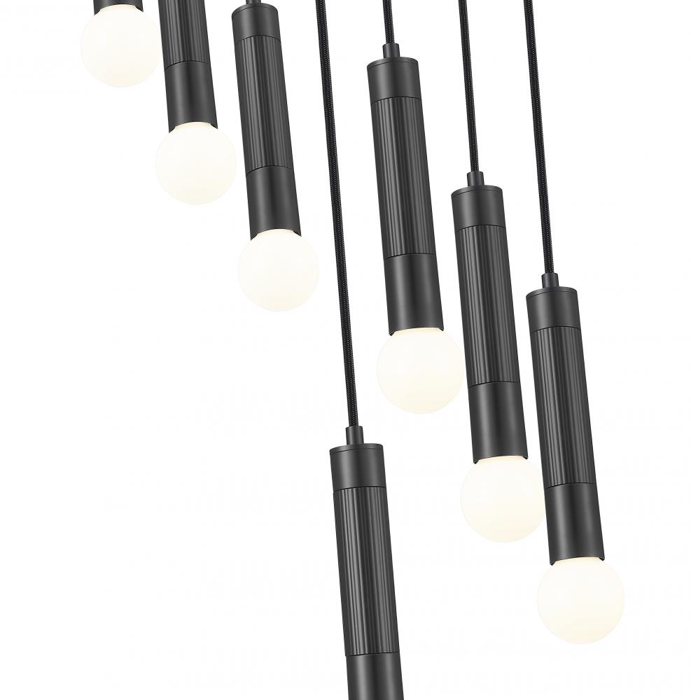 Create a refined focal point over your entry or dining room with this modern seven-light chandelier. A round canopy and elongated tubes receive a deep matte black finish that ensures bold contrast in virtually any setting. Petite lights offer bright, lovely illumination while braided cording is a sophisticated finishing touch.