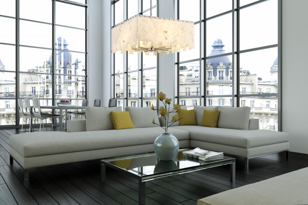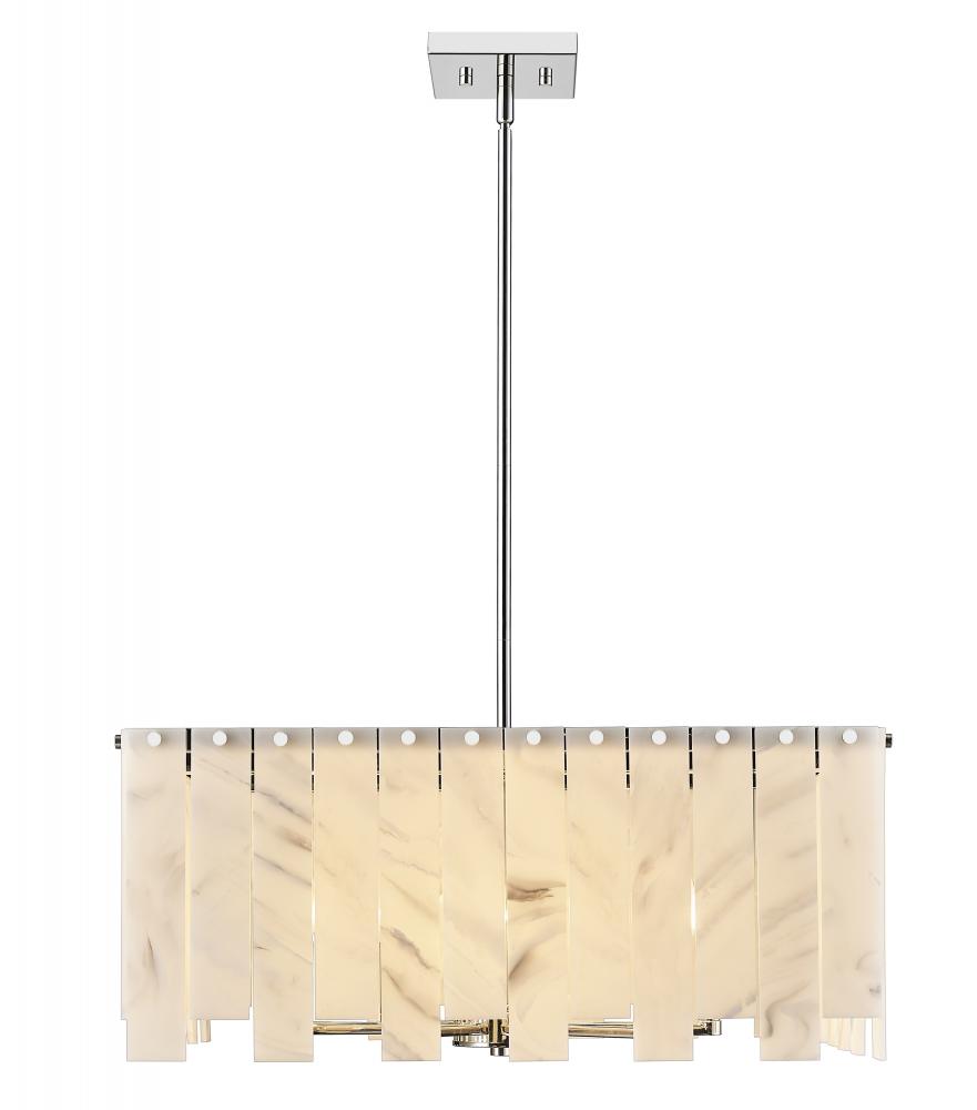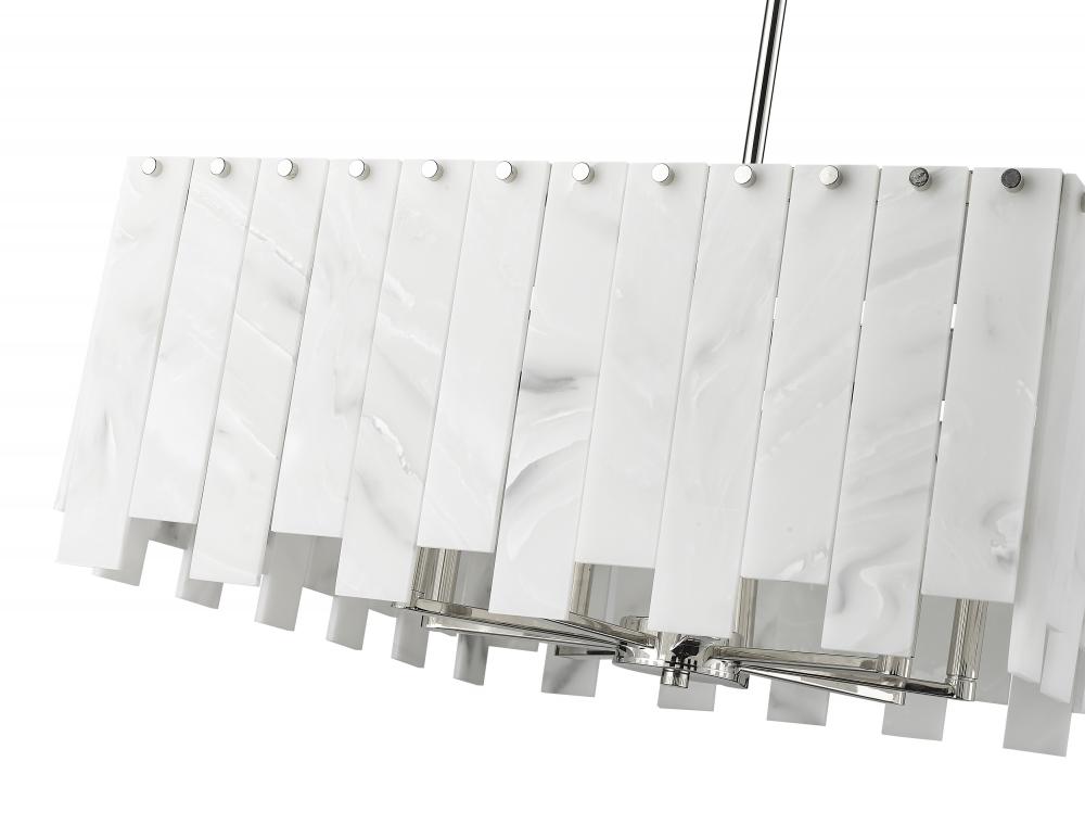 Fashion a compelling d?cor boost in the form of an Art Deco influenced fixture with gallery inspiration. Choose this decadent eight-light pendant from the Viviana collection to offer both easy palette elements and a chic look with alabaster-like strips alternating in length and arranged around a rectangular polished nickel finish steel frame. Whimsical rivot detailing adds an industrial feel to this pendant that goes with the flow as it complements a gritty rendition of toned-down glam in a kitchen or entryway.