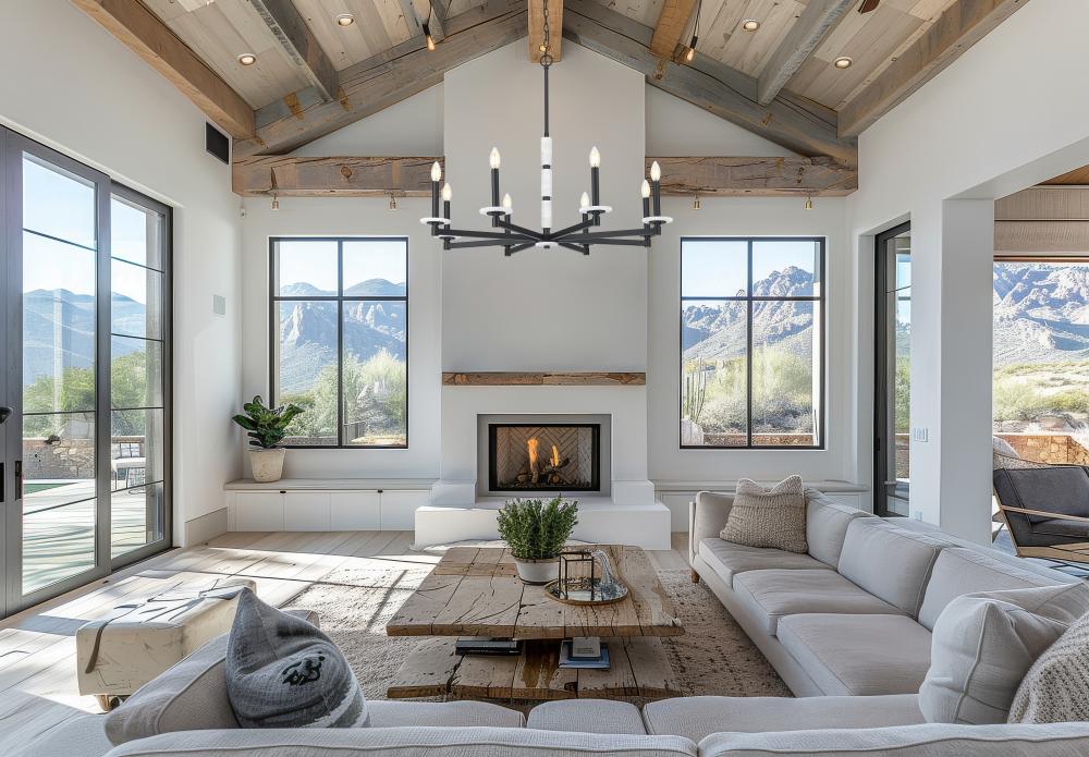 This chandelier brings bold elegance to the heart of the room. Eight alabaster spheres circle a matte black frame, offering contrast and glow in perfect measure. With its sculptural layout and soft light, it?s made to captivate.