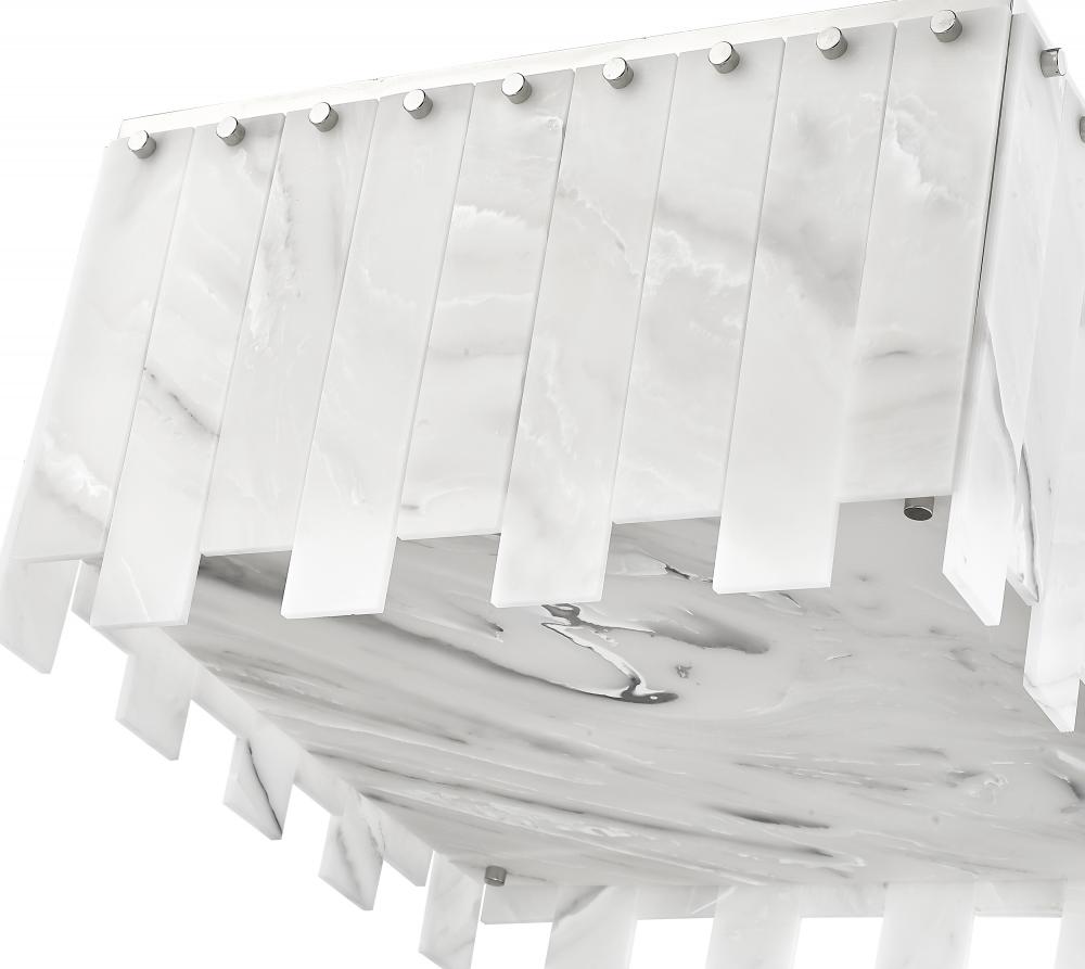 Creating a striking look of surprising simplicity merged with Art Deco gallery style, this nine-light flush mount ceiling light from the Viviana collection creates impact with alabaster-like strips alternating in length and arranged around a rectangular polished nickel finish steel frame. Whimsical rivot detailing adds an industrial feel to this flush mount light that goes with the flow as it complements a gritty rendition of toned-down glam in a kitchen or entryway.