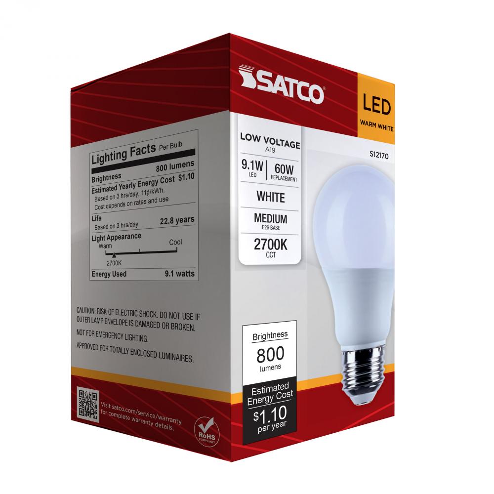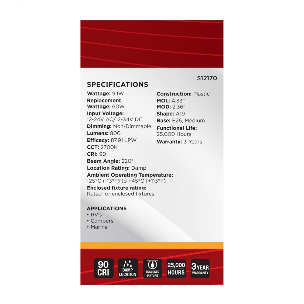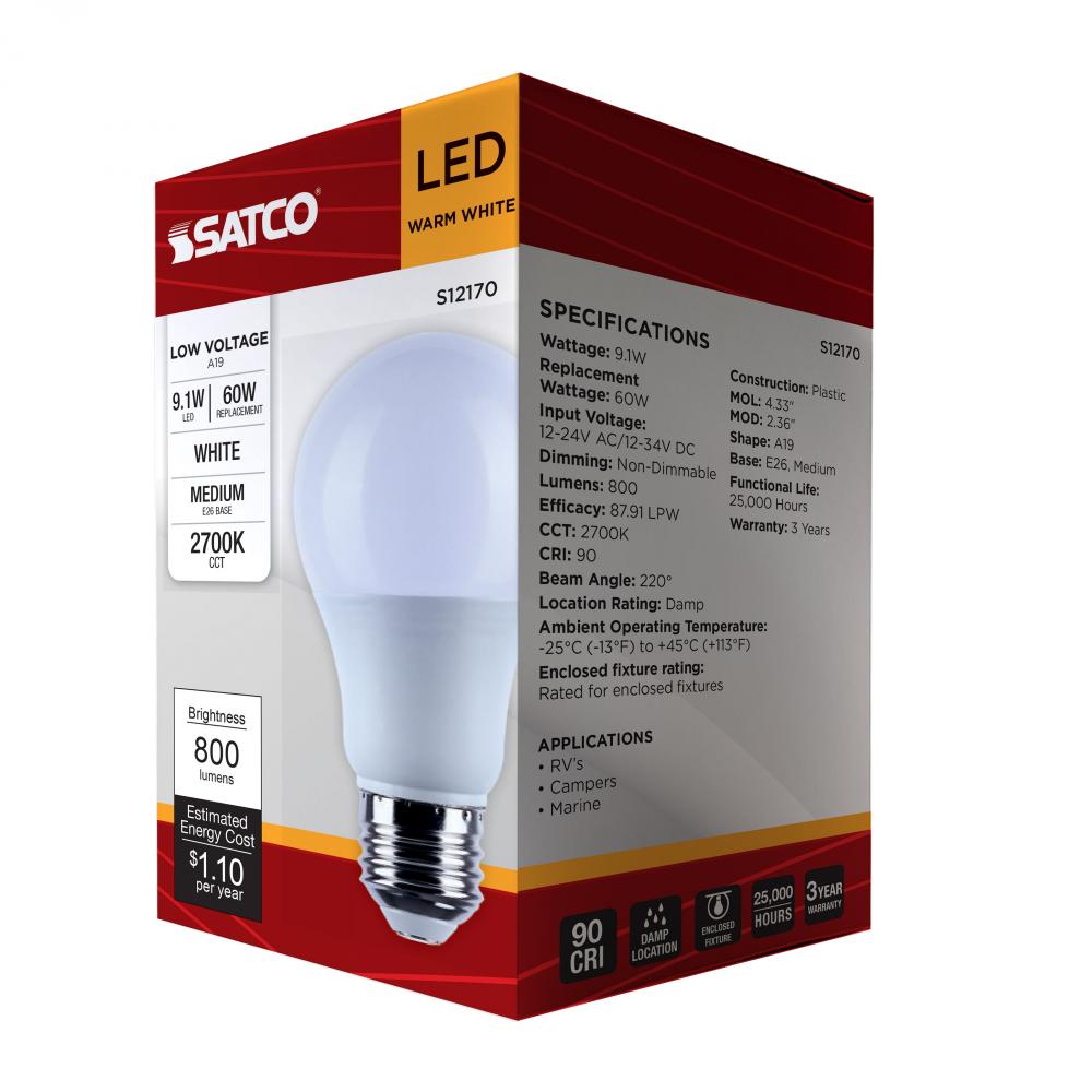 Designed for versatility and reliability, SATCO NUVO'S low voltage S12170 2700K A19 LED lamp operates on 12-24V AC or 12-34V DC, making it an ideal solution for off-grid, solar-powered, and battery-operated systems. Featuring a standard E26 base, it in