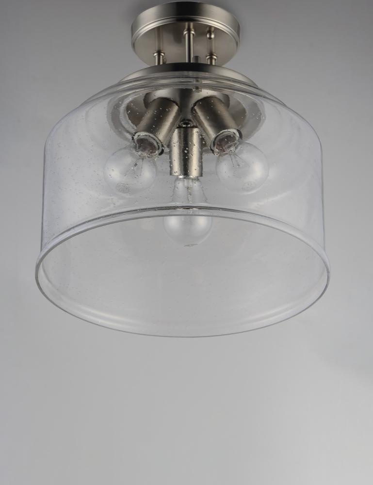 A modest frame of steel tubing gently bends to support a cluster of Clear Seedy bell-shaped glass. Similarly the bobeches and other metal accents echo that traditional bell shape creating an instant classic. An easy choice with transitional appeal, choose