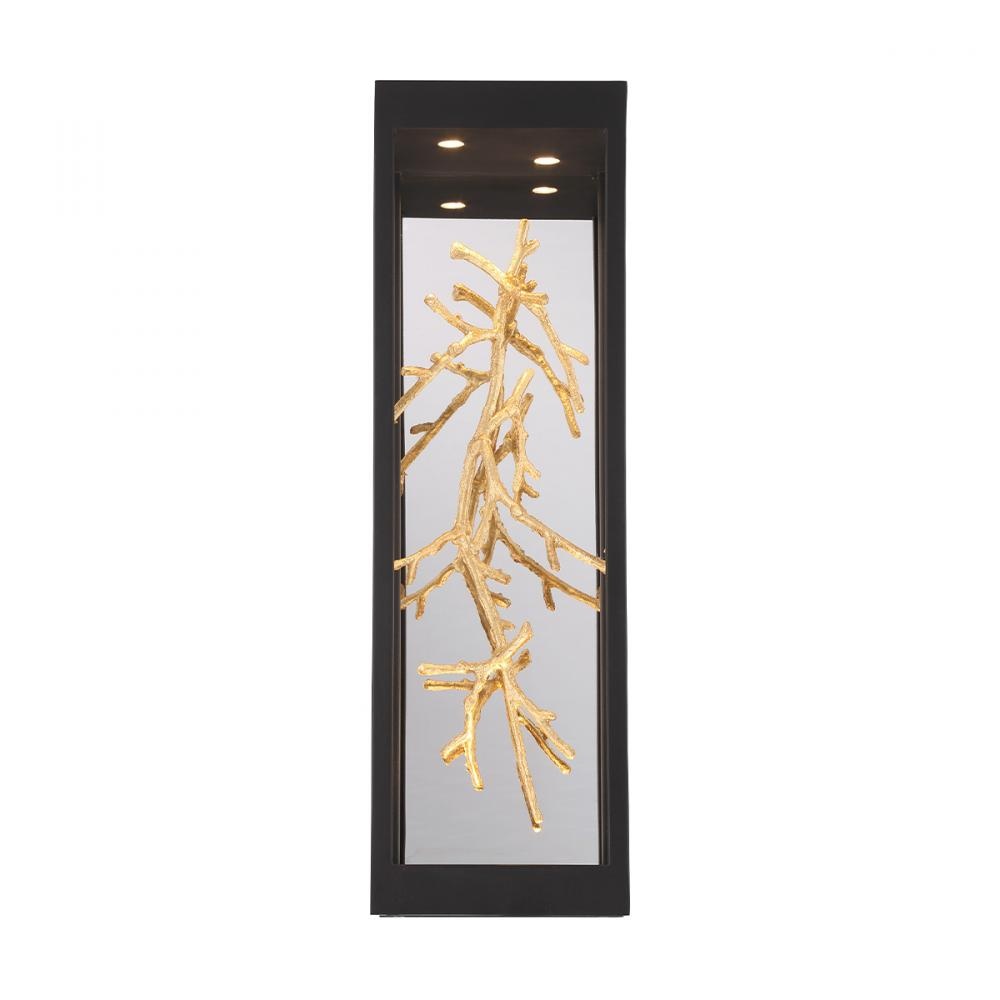 Free-flowing, gilded branches of gold float elegantly within a stylish open cage constructed of cast brass and finished for the rigors of outdoor environments. The thin twigs are handcrafted with metal foil and accentuated by pinhole recessed LED lighting to add a luxurious glow to this nature-inspired collection.