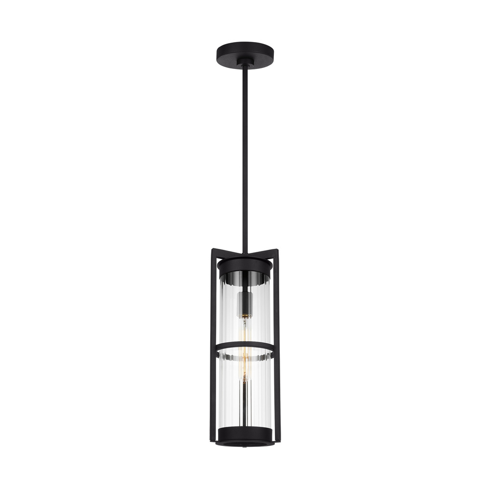 Clear fluted glass shades give the Alcona series a refined industrial look. The elegant square backplate and metal center ring provide a floating glass effect. The Alcona one light outdoor pendant fixture creates a warm and inviting welcome presentation for your home's exterior. Available in a handsome Black or Antique Bronze finish.